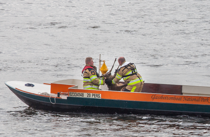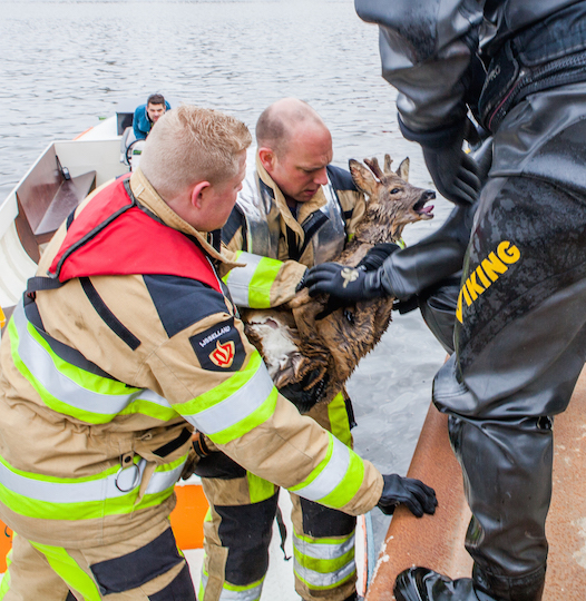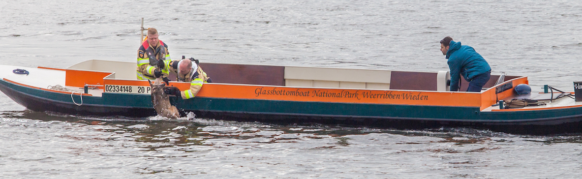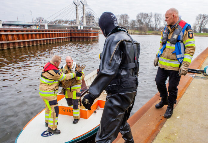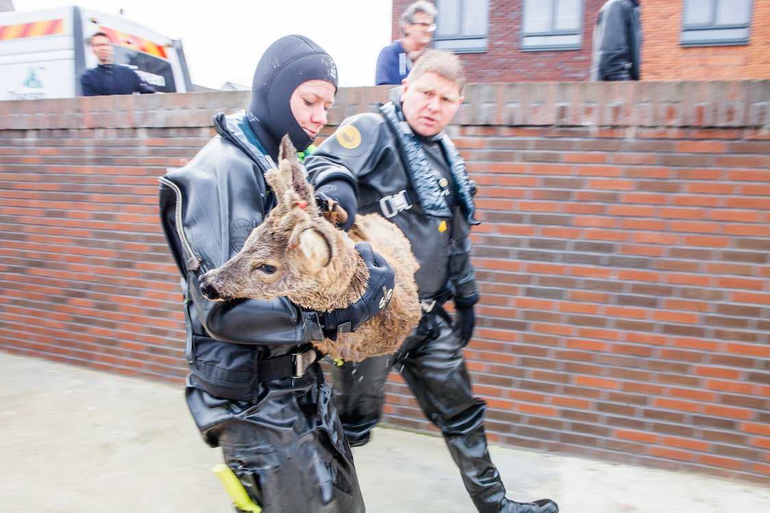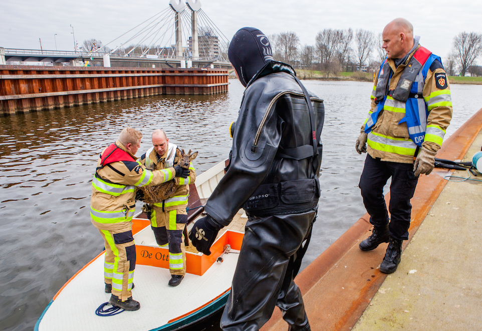 Om het dier in het water te kunnen bereiken en redden charterde de brandweer een boot. Nadat het onfortuinlijke dier op het droge werd gehaald, werd er nog een tijdlang gewacht op een bijzonder ambtenaar voor wild. Het dier leek ietwat gewond te zijn aan zijn kop. Pas na controle door deze ambtenaar mag de dierenambulance de ree meenemen.