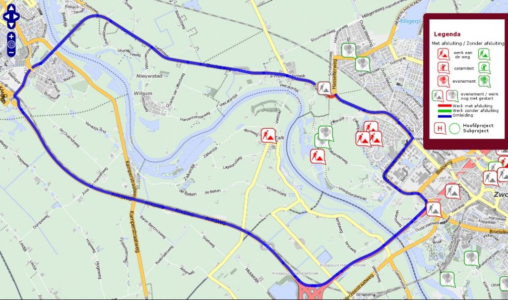 Door asfalteringswerkzaamheden aan de Zwolseweg, vanaf de kruising van de Hasselterweg richting ’s Heerenbroek, wordt de doorgaande route richting Kampen een week lang afgesloten. Vanaf 30 mei tot 4 juni zal het doorgaande verkeer richting Kampen hierdoor via de snelweg en de N50 moeten omrijden. Dit levert een extra reistijd van tien tot dertig minuten op voor de mensen die richting Kampen moeten.