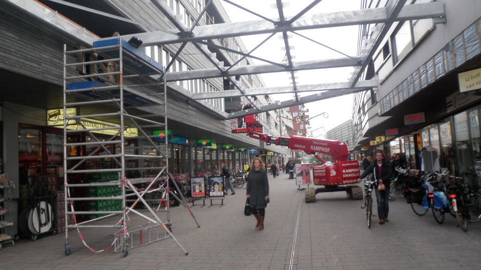 Eerder berichtte Stadshagennieuws al dat er een grote luifel boven de Wade geplaatst zou worden in verband met de harde wind die door de winkelstraat raast. De werkzaamheden zijn inmiddels in volle gang. Vorige week werden er al platen verwijderd waar het stalen frame aan wordt gemonteerd. Het frame is zondag op zijn plaats gehesen zodat aan de veiligheidseisen kon worden voldaan en het winkelende publiek niet gehinderd werd.