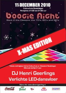 Boogie Night staat bekend als het kleine eigenwijze zusje van Generation Classics Party. Het is een sfeervol en swingbaar feest. DJ Henri Geerlings draait hits uit the 70’s, 80’s and 90’s met dit keer een vleugje X-mas. Bezoekers kunnen heerlijk swingen op de LED-verlichte dansvloer L.