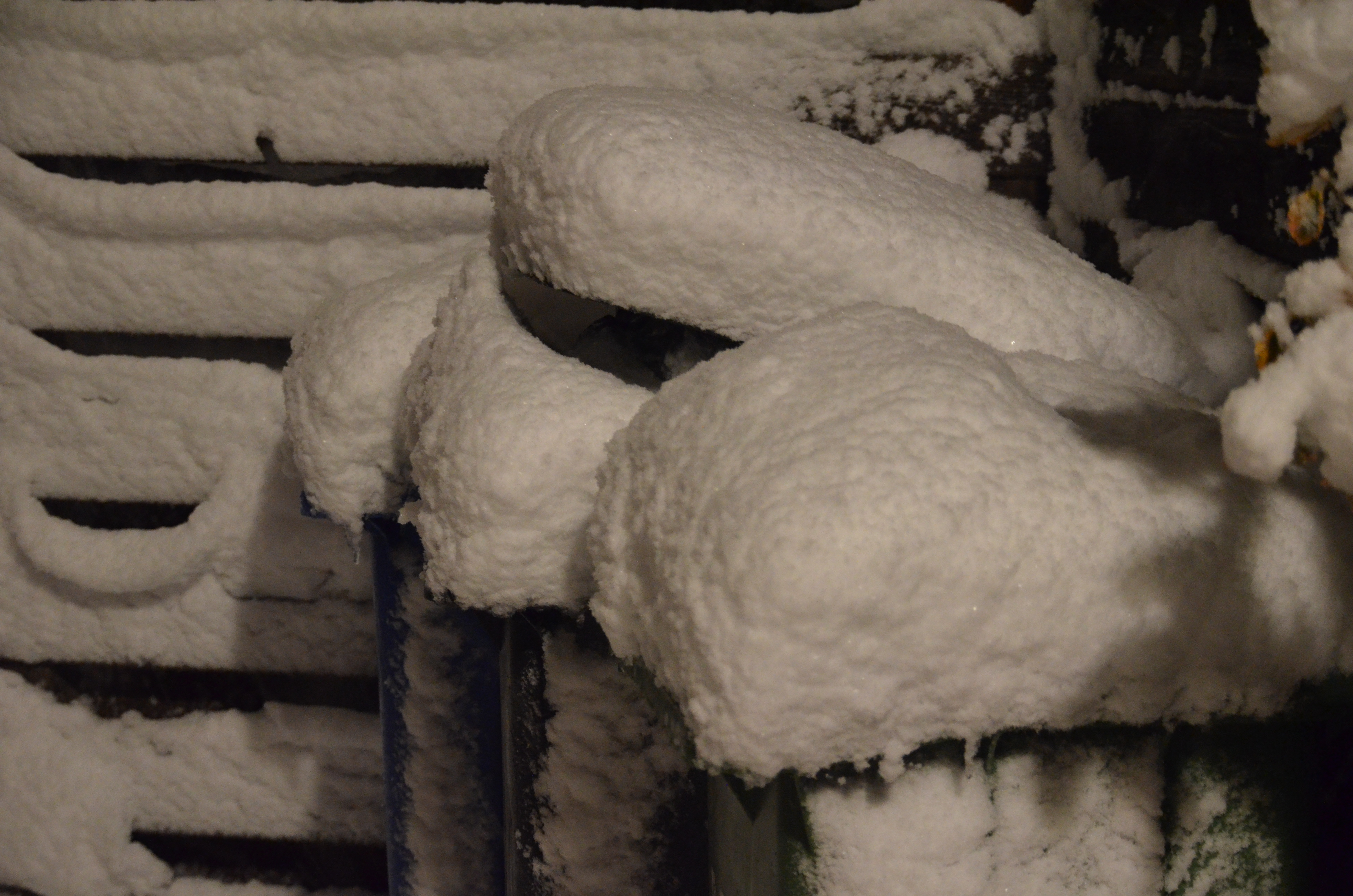 Op de hoofdwegen rijden sneeuwschuivers af en aan. Sierlijk draaien ze rondjes over de rotonde, het blad naar binnen en buiten bewegend om de sneeuw van de weg af te krijgen. Elders blijft de sneeuw bijna geruisloos vallen. Centimeter voor centimeter stapelt zich op auto’s, containers, schuttingen en stoepen. Lang kunnen we er niet van genieten, maar mooi is het wel.