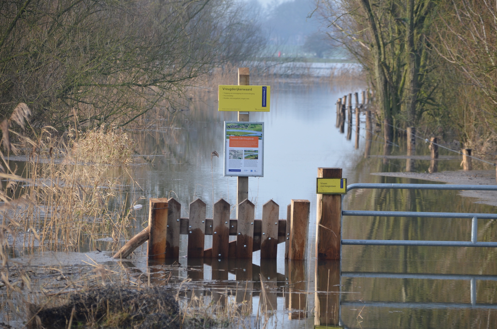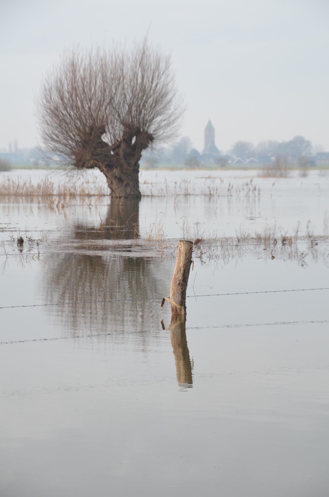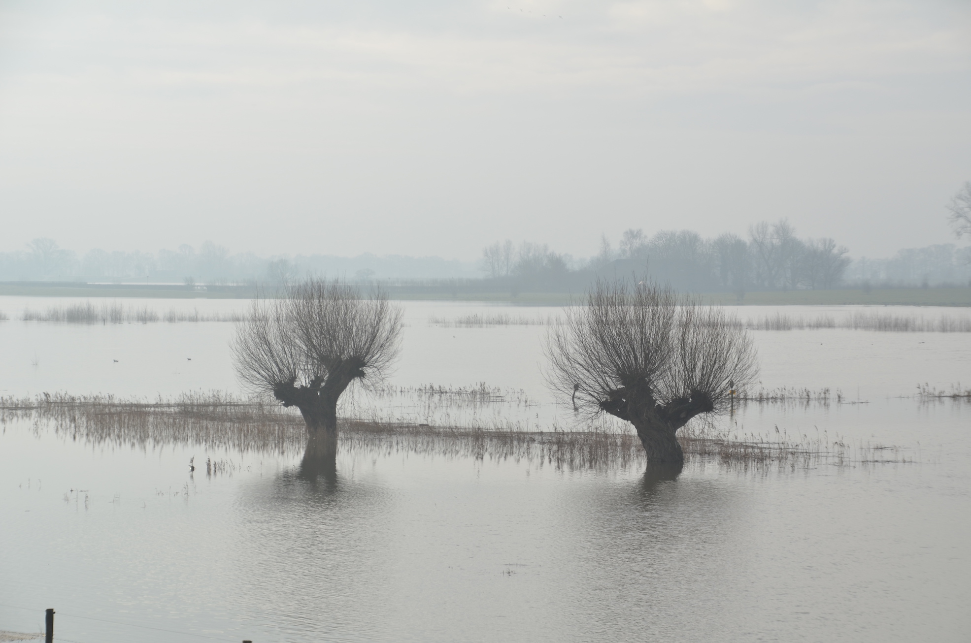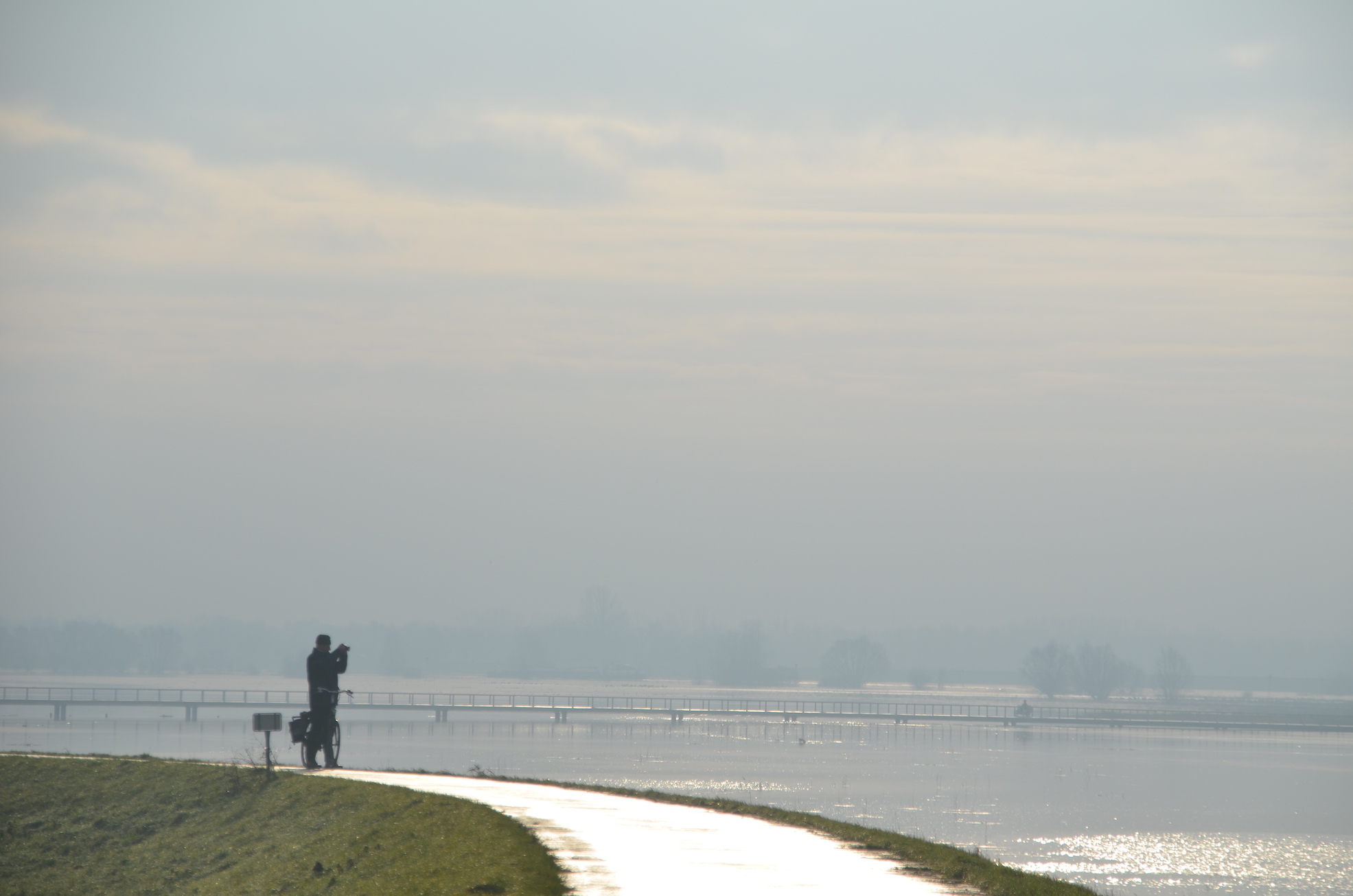 Over het fietspad op de dijk die het wassende water moet tegenhouden staan mensen even stil naast hun fiets. Turend over de immense vlakte van water, af en toe onderbroken door de kruin van een knotwilg. Een reiger staat op een paaltje, op de achtergrond prijkt de kerktoren van Zalk. Ondanks het geweld van het opzwellende water overheerst de stilte in het prachtige rivierengebied.