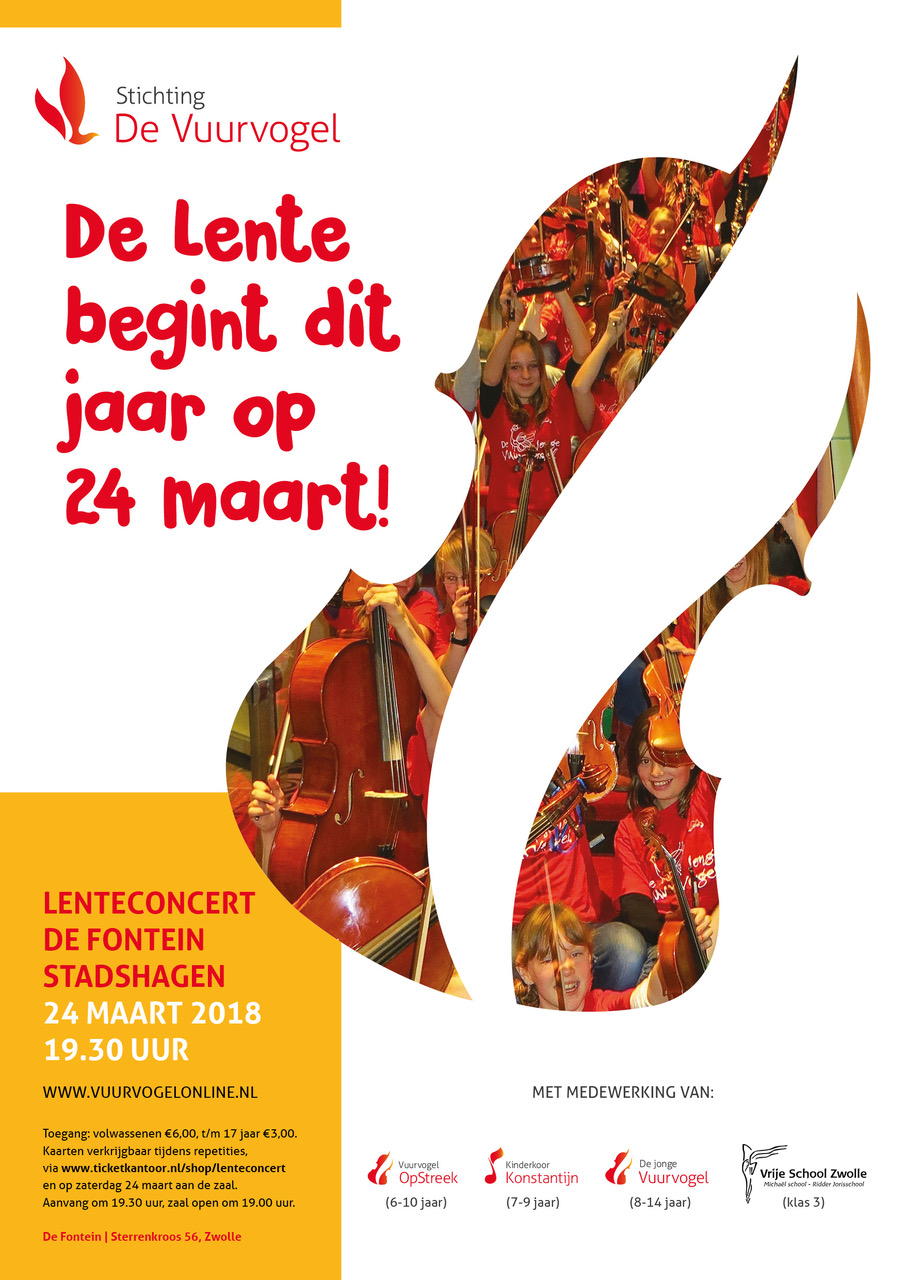 Zaterdag 24 maart begint de lente in de Fonteinkerk in Stadshagen. Met een feestelijk Lenteconcert zullen de jongste leden van jeugdorkest de Vuurvogel zich afzonderlijk en samen presenteren. Uniek is deze keer ook de samenwerking met klas 3 van de Vrije School die ook deelneemt aan dit vrolijke concert.