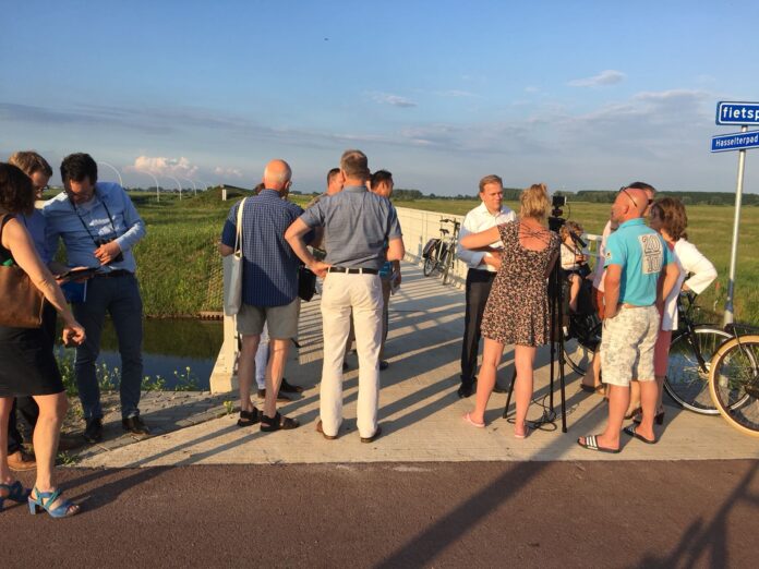 Een groep wijkbewoners, politici en media kwamen bijeen op de Oude Wetering, om de vlucht gezamenlijk te ervaren.