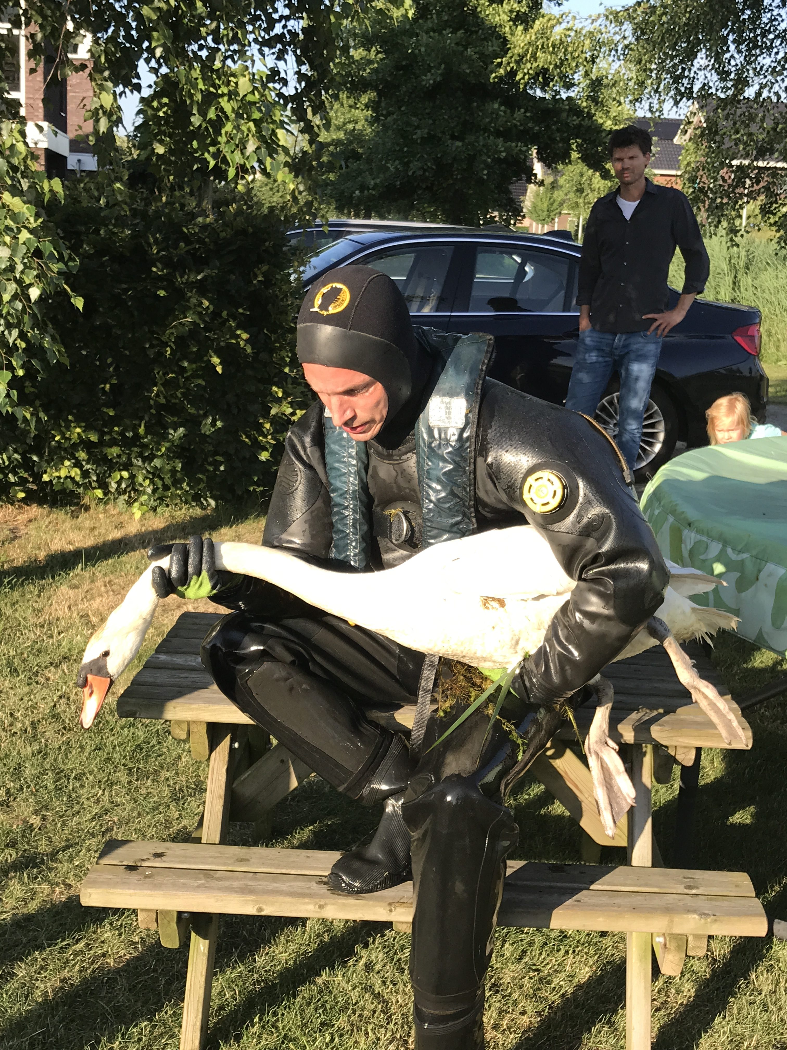 De gewaarschuwde dierenambulance kon de moederzwaan niet te pakken krijgen, mede door optreden van vader-zwaan. Daarop werd het duikteam van de brandweer ingezet. Drie duikers gingen te water en uiteindelijk lukte het om de moederzwaan te vangen. Pas op dat moment werd duidelijk dat de jonge zwaan met een plastic draad vast zat aan de moeder en zo is verdronken.