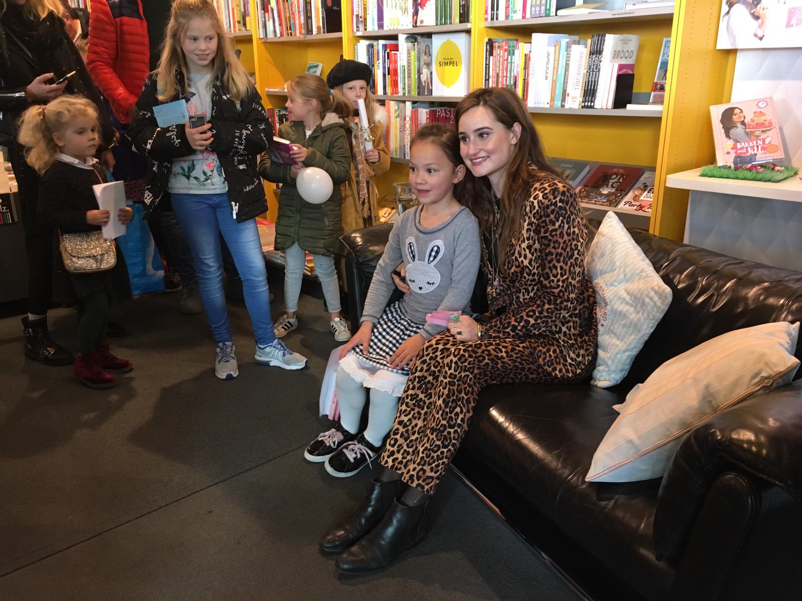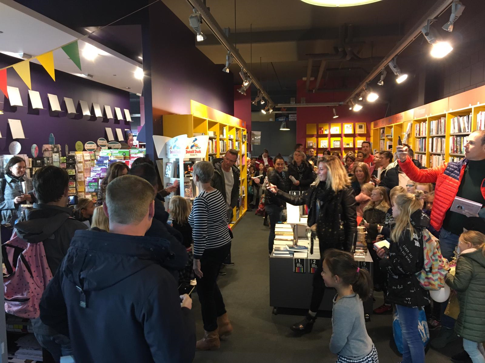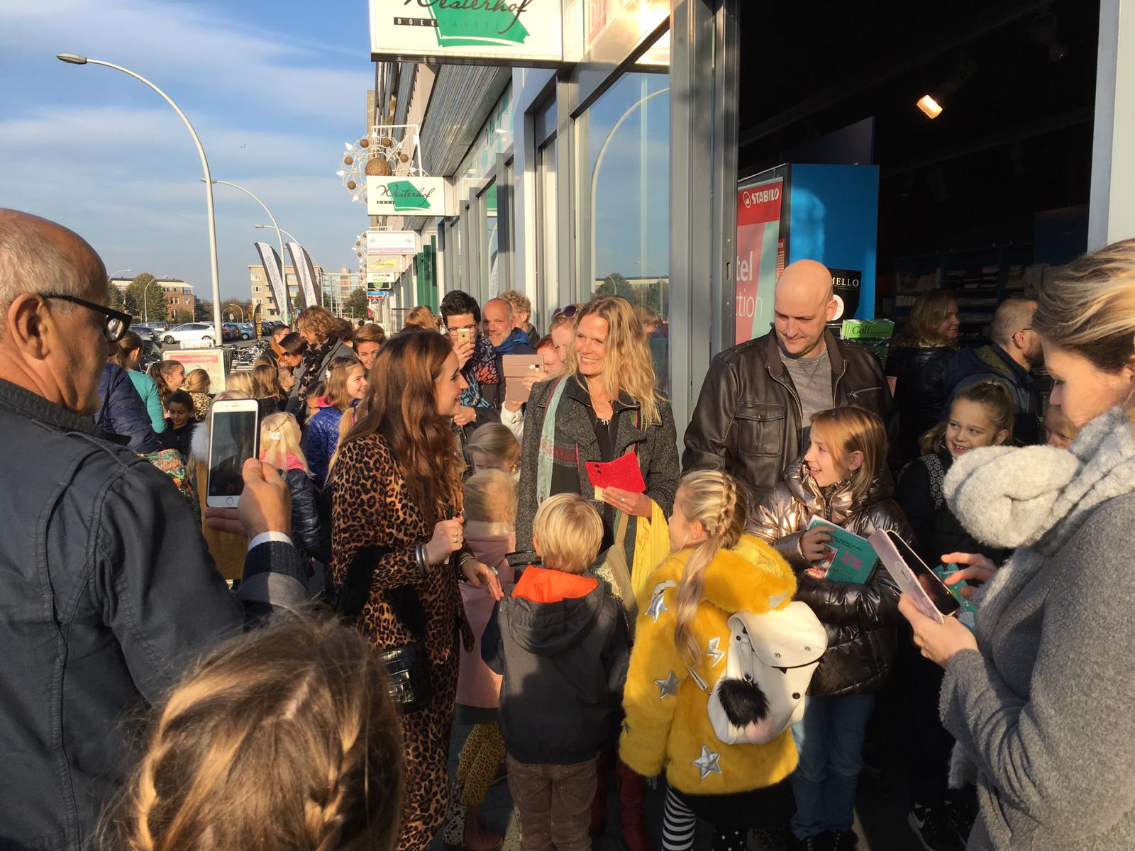 De rij stond tot ver buiten de boekwinkel, door de winkel heen. Iedereen kom zo een handtekening krijgen van Jill en met haar op de foto.