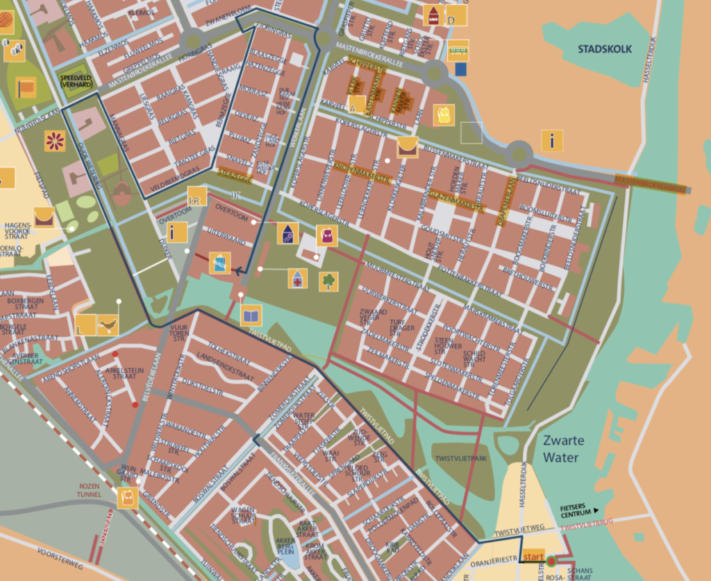 De optocht wordt begeleid door de pietenband Paardenvoetjes en voert vanuit het haventje over het Twistvlietpad, Oude Wetering, Mannagras, Veldbeemdgras, Bermzegge, Zwanenbloem en Werkerlaan. We komen rond 14.00 uur aan in het winkelcentrum van Stadshagen, waar de Sint feestelijk wordt onthaald en we met zijn allen liedjes zingen voor de Sint!