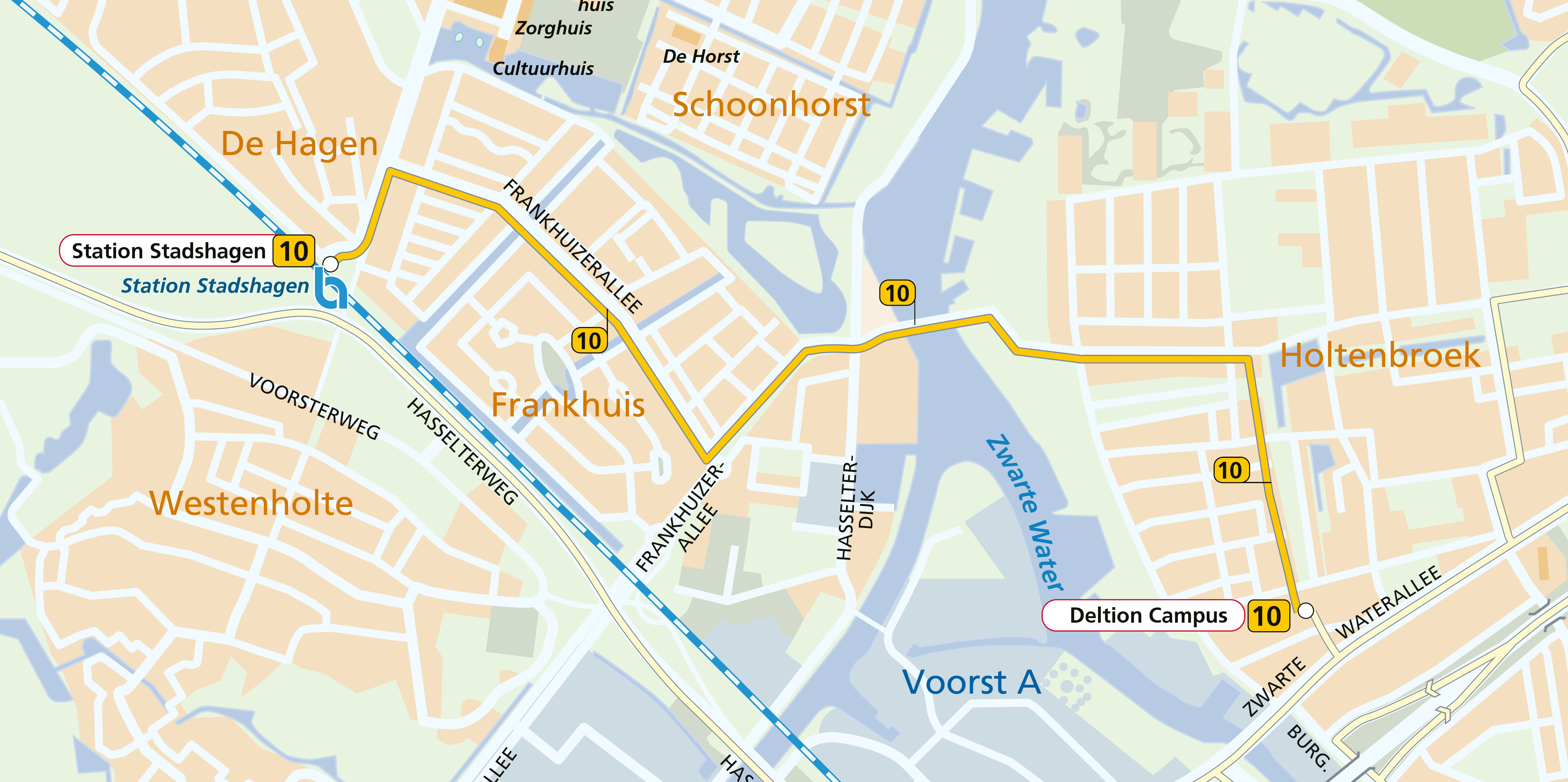 Speciaal voor scholieren en forenzen richting de Deltion Campus rijdt tijdens de proef ’s morgens in de spits vanaf station Zwolle Stadshagen buslijn 10. Deze tijdelijke buslijn brengt de reizigers van het station direct naar de Deltion Campus. De bussen hebben een gegarandeerde aansluiting op de treinen vanuit Kampen en vertrekken om 8:10, 8:40, 9:10 en 9:40. Reizigers die gebruik maken van lijn 10 zijn naar verwachting tien minuten eerder op Deltion Campus dan met de huidige reismogelijkheden via station Zwolle en buslijn 9.