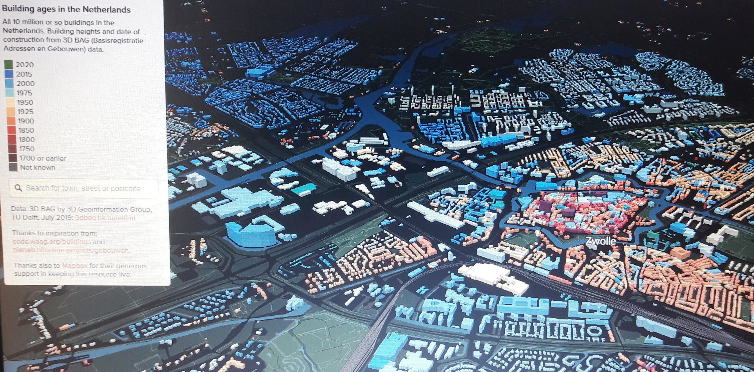 Op de kaart heeft elk gebouw een blokje en een kleur. Deze geeft in eerste instantie een ruime tijdsaanduiding, bijvoorbeeld 1800-1950. Op de kaart van Zwolle zijn goed de historische verschillen in wijken te zien. Zo kleurt de binnenstad roder dan veel andere gebieden, hetgeen het oude karakter van het gebied weergeeft. Het zal geen verrassing zijn dat Stadshagen (links bovenin) flink blauw kleurt en behoort tot de jongste bebouwing van Zwolle. Nog interessanter wordt het wanneer de cursor op een concrete woning wordt geplaatst en het bouwjaar ervan in beeld verschijnt.