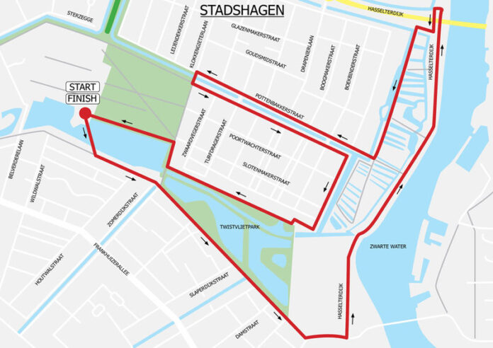 Het parcours van de 5 en 10 km loopt via het Twistvlietpark, het Zwartewater en het groene hart van Stadshagen. De 10 km-lopers leggen deze route twee keer af (zie afbeelding).