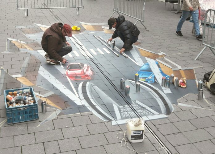 Menige Stadshagenaar fronste de wenkbrauwen toen hij deze week in het winkelcentrum van Stadshagen liep. Het leek op een illegale graffitiactie van twee mannen die hun verfspuiten leeg spoten op het plaveisel. Maar nee, het bleek echte zogeheten street-art te zijn: twee professionele kunstenaars die in opdracht van de winkeliersvereniging wat meer kleur op de wangen van het winkelcentrum aanbrachten. Na twee dagen spuiten was het 3D-werkstuk compleet. Street-art is een kleurrijk cadeautje in een wat grijze entourage.