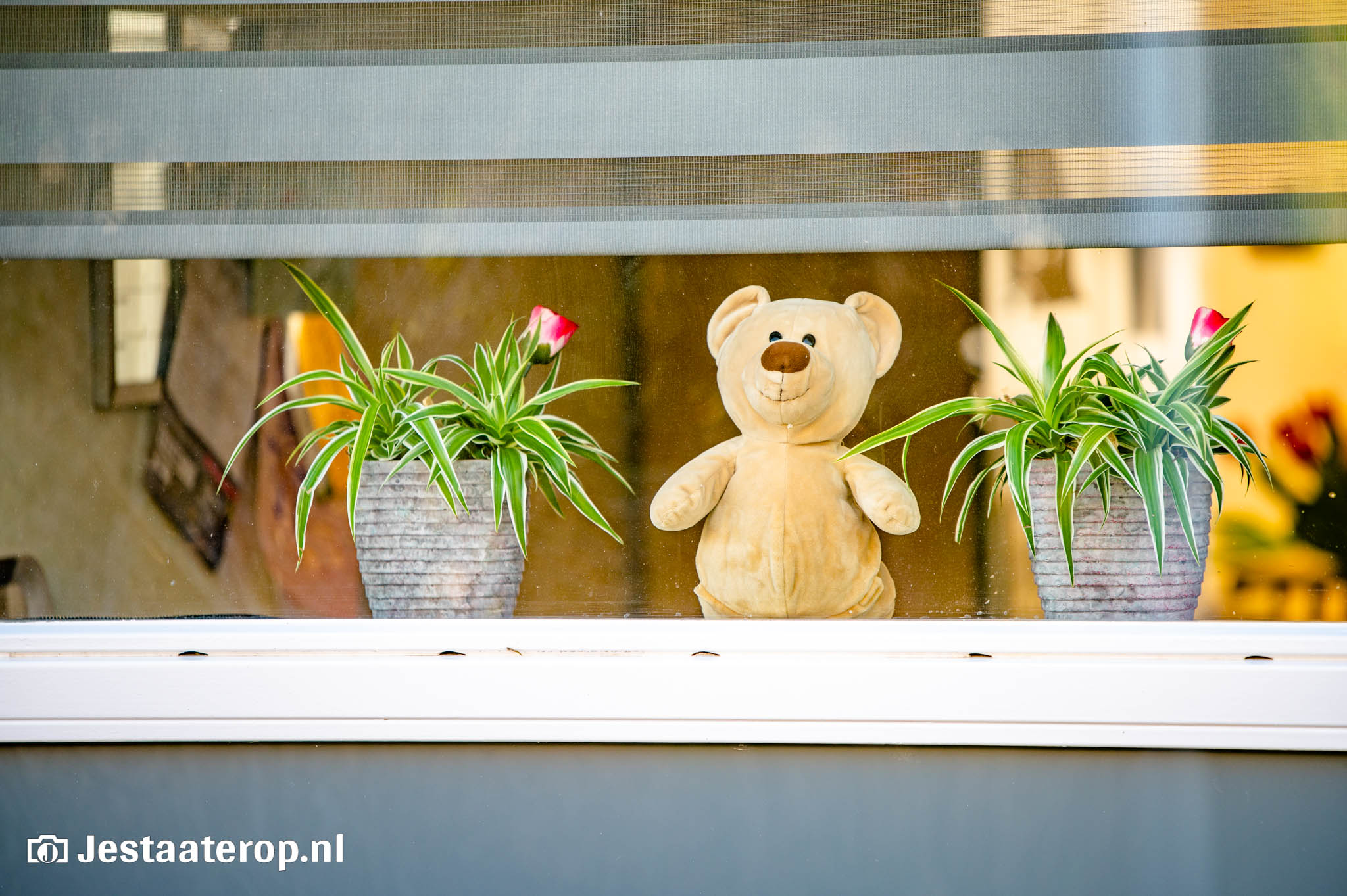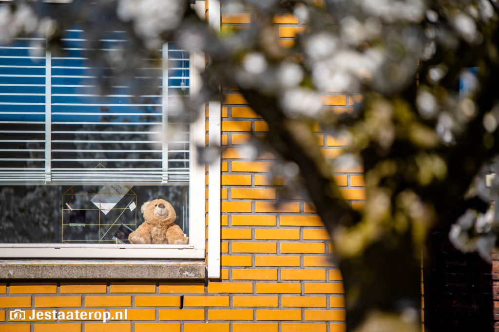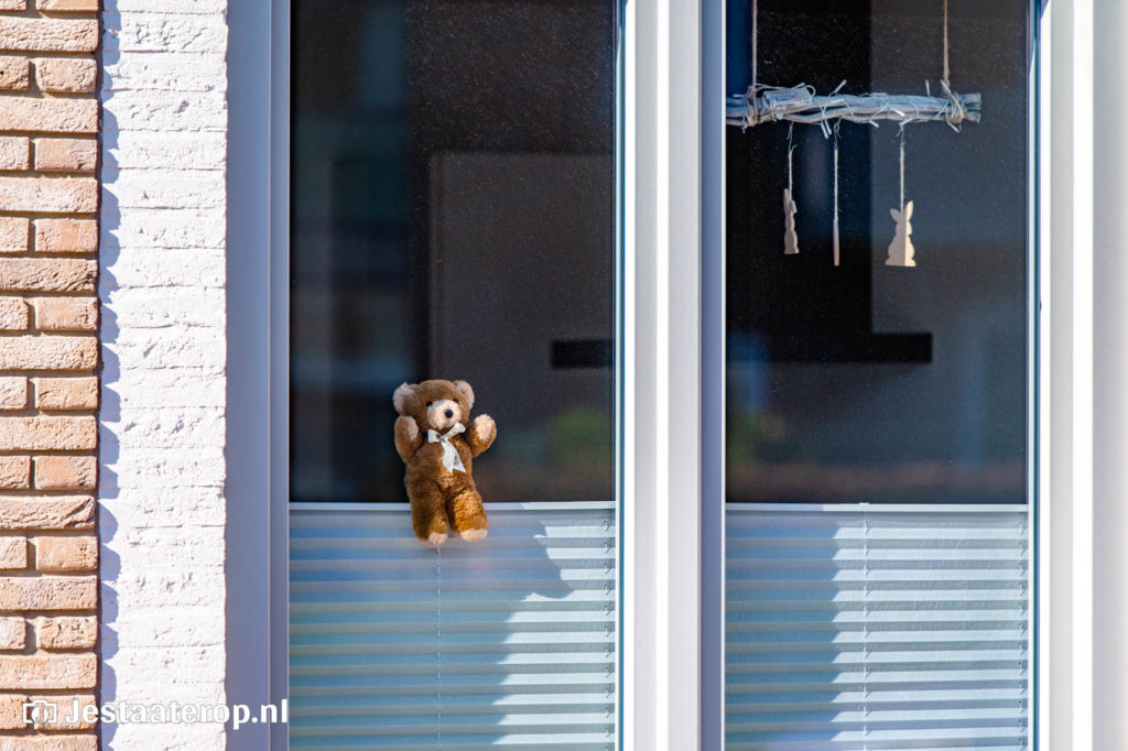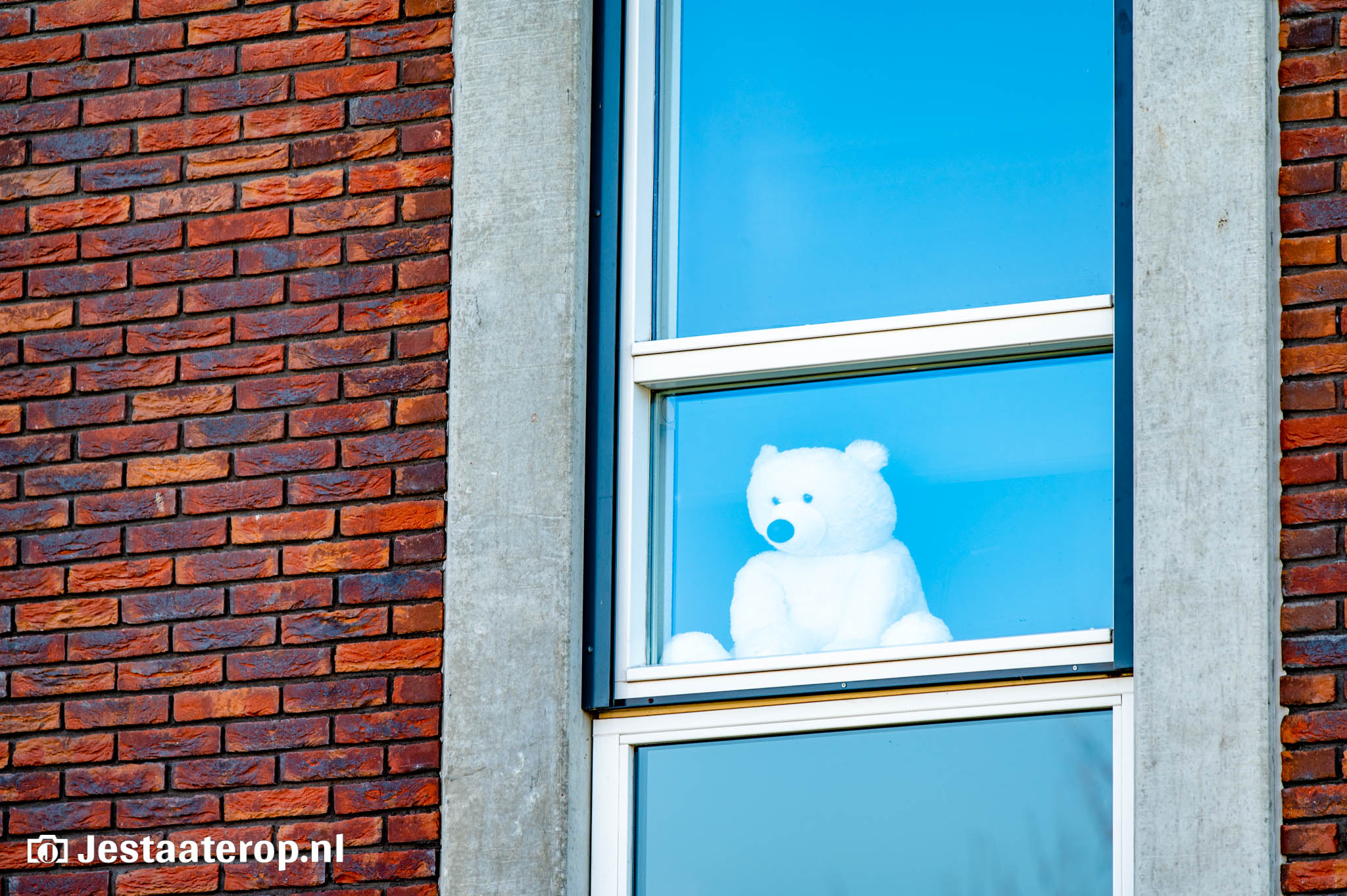 Een oproep op social media heeft ervoor gezorgd dat bij honderden huizen in Stadshagen een knuffelbeer voor het raam staat. Kinderen kunnen daardoor op berenjacht, zodat ze iets leuks te doen hebben als ze even naar buiten mogen.
