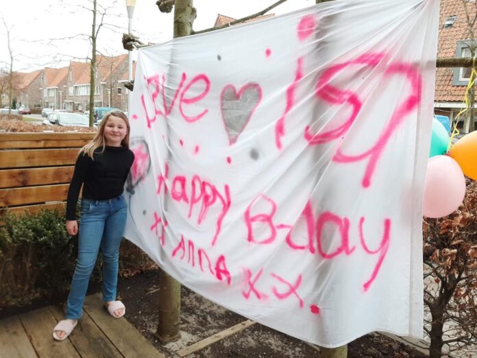 Wanneer je 11 jaar wordt, wil je dit groots vieren met je beste vriendinnen en trakteren in de klas. Als dat door de Corona-maatregelen allemaal niet mogelijk is, ziet je verjaardag er ineens heel anders uit. Het werd voor Isa Ringnalda vandaag een klein feestje met papa, mama en zusje Lotte. En een groot spandoek in de tuin!