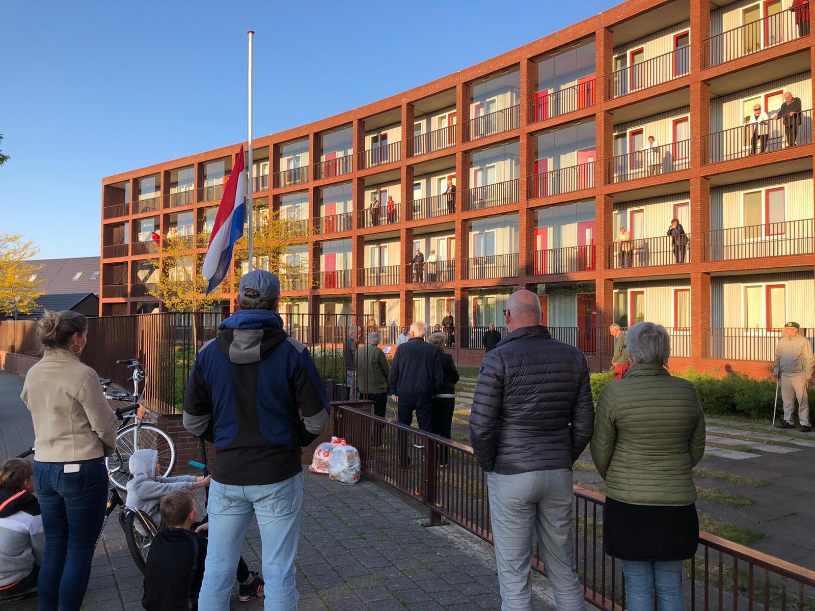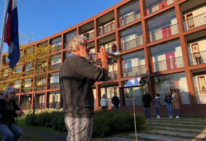 Na twee minuten stilte klinkt er het Wilhelmus. “Die speel ik twee octaven lager”, vertelt Hogenboom zich verontschuldigend vooraf. “Anders is het voor deze trompet te hoog”. De bewoners van het Hoge Huis en enkele wijkgenoten die op gepaste afstand de herdenking bijwonen zingen mee. Daarna klinkt er een gepast applaus voor de trompettist.