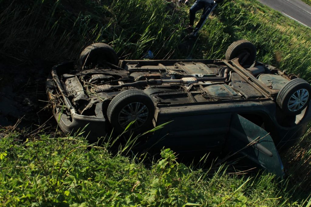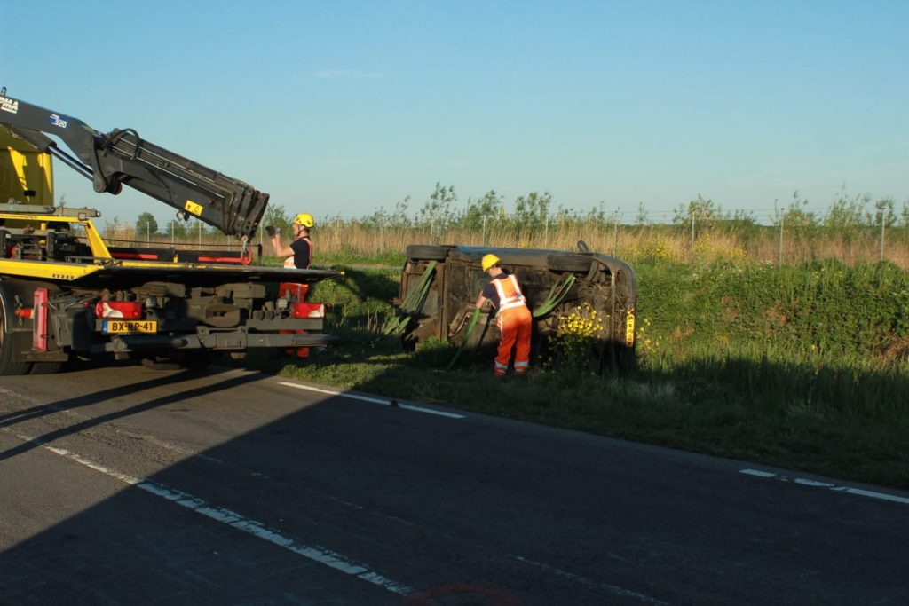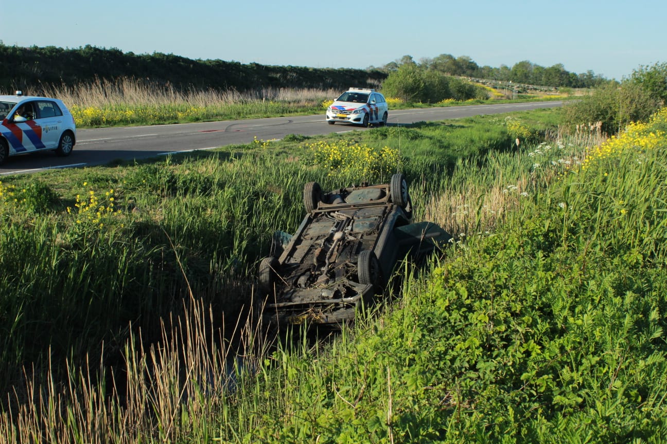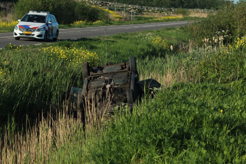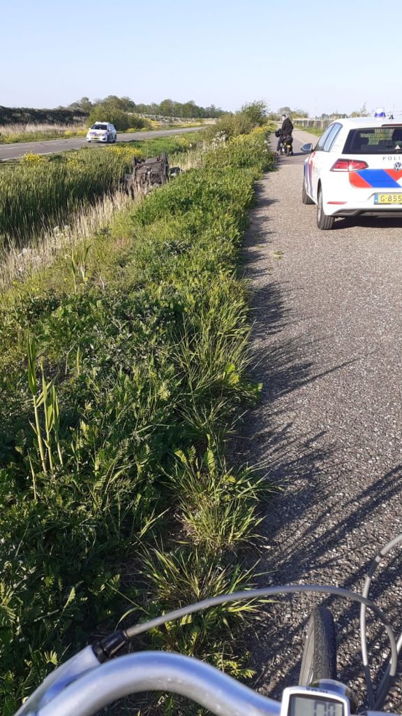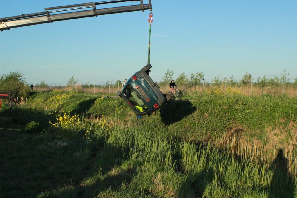 De auto is later op de avond uit de greppel gehaald door een bergingswagen.
