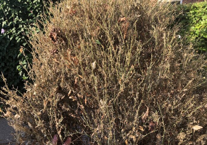 In verschillende straten in Stadshagen valt het op: compleet kaalgevreten en dorre buxusstruiken. Ditmaal is niet de droogte de schuldige, maar vele tientallen tot honderden rupsen per struik die letterlijk de blaadjes van top tot teen wegvreten.