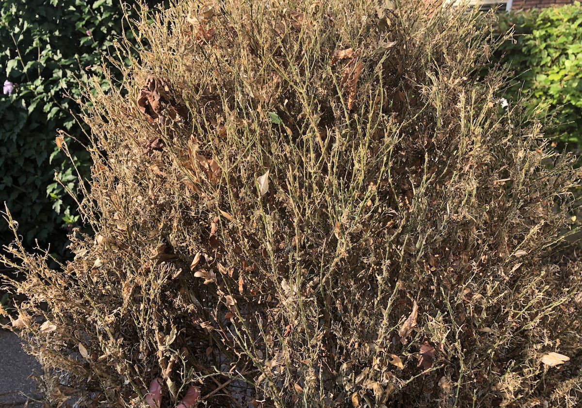 In verschillende voortuinen staan de buxussen er triest bij. Dorre, gele struikjes. Soms hele tuinen vol. En ook al zouden ze de vreetpartij kunnen overleven, veel tuiniers trekken de dode struiken al uit de tuin.