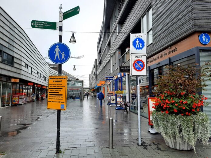 Bij beide ingangen van het winkelcentrum hangen nu drie borden om aan te geven dat je een voetgangersgebied betreed. Daarmee geldt in het winkelcentrum nu officieel een fietsverbod.