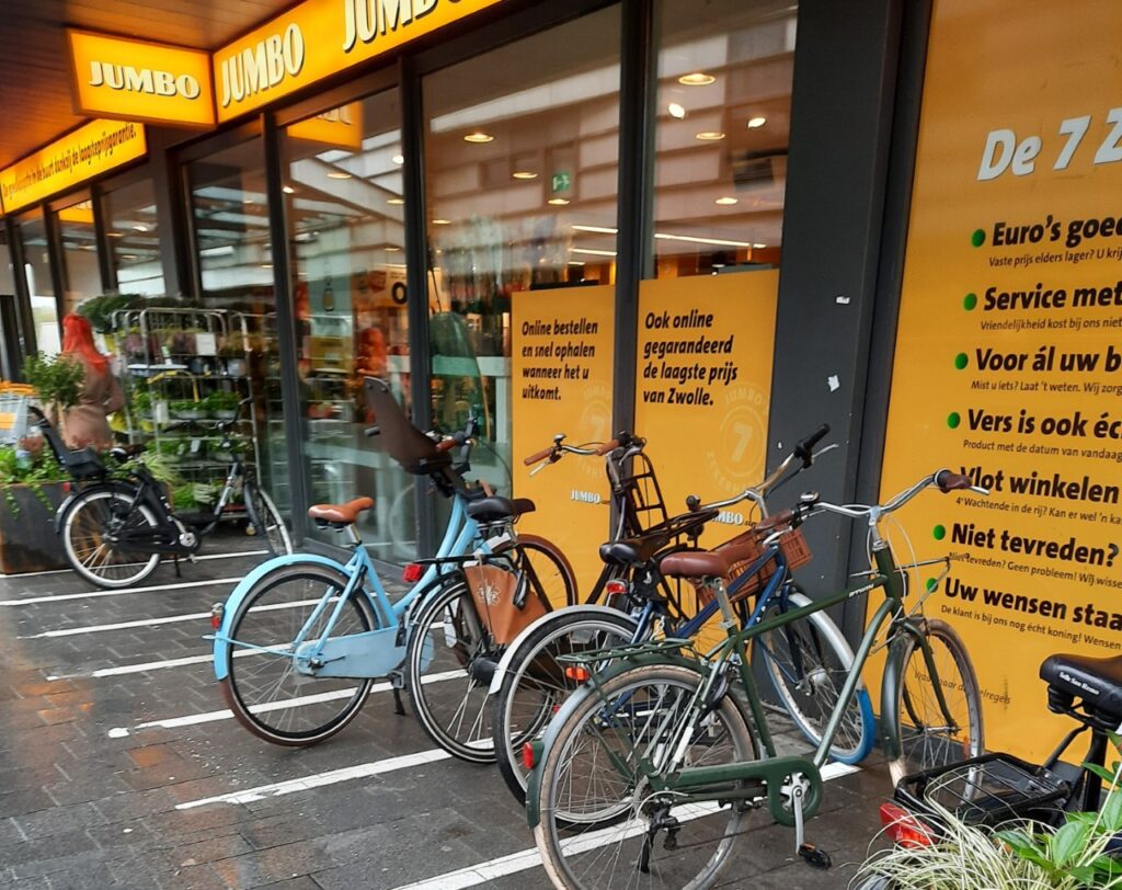 En heeft u de speciale fiets-parkeervakken bij de Jumbo en Albert Heijn gezien? Deze zijn bedoeld voor mensen die slecht ter been zijn. Dit kan nog wel duidelijker aangegeven worden: de fietsen stonden donderdag al wel keurig in de vakken, maar het valt te betwijfelen of deze fietsen allemaal van mensen zijn die slechter ter been zijn.