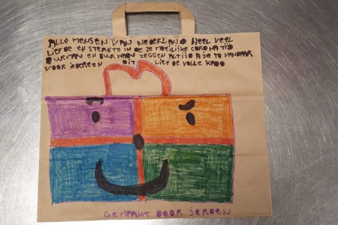 Door de tijdelijke sluiting van de horeca is Bistro de Stadshoeve opnieuw overgeschakeld op het thuisbezorgen van de lunch of diner. En dat doen zij sinds deze week nog vrolijker! Cliënten van Frion (een organisatie voor mensen met een verstandelijke beperking) versieren de bezorgtasjes namelijk als echte kunstenaars. Zij maken er tekeningen op, met een lieve boodschap voor de ontvangers.