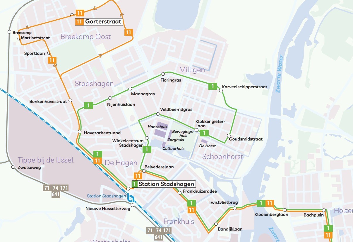 Voor Stadshagen worden de volgende wijzigingen doorgevoerd: Buslijn 1 begint bij het busstation in het centrum en heeft als eindpunt het station in Stadshagen. Daarmee stopt lijn 1 weer bij de haltes Nijenhuislaan (bij het Zonnehuis) en de Havezathenallee (bij ’t Hoge huis). Buslijn 11 rijdt vanaf het station in het centrum via het station in Stadshagen een ronde door Breecamp. Buslijn 10 komt te vervallen. In plaats daarvan kan vanaf 13 december lijn 11 worden gebruikt.