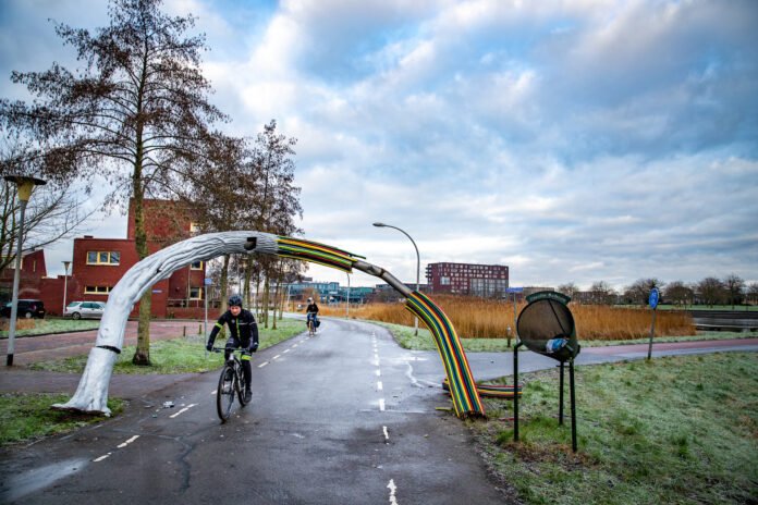 Het kunstwerk raakte afgelopen weekend zo zwaar beschadigd, dat de gemeente het zwaar over het fietspad hellende gevaarte heeft moeten verwijderen.