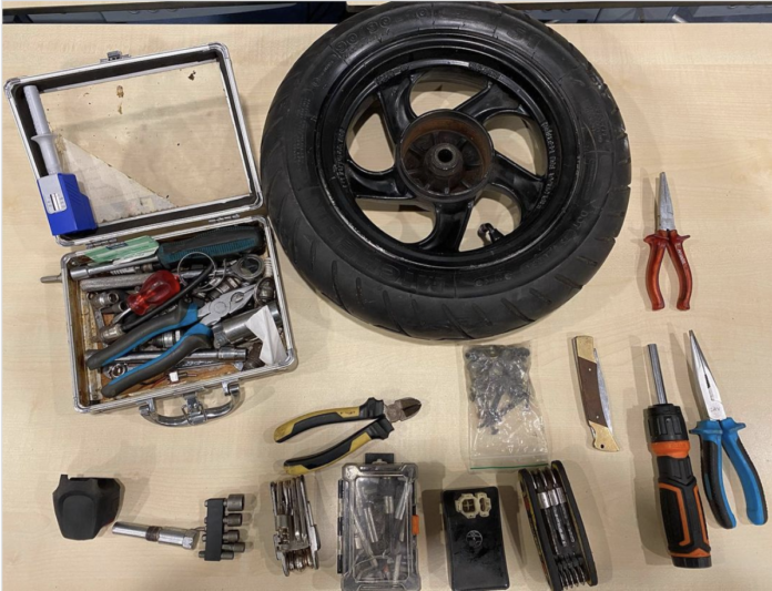 Tijdens het doorzoeken van de scooter vond de politie de spullen op bijgevoegde foto, welke zij aanmerken zijnde inbrekerswerktuigen. Gezien het tijdsstip is het verboden om dit bij je te hebben ’s nachts. Er werd ook een band gevonden waarvan de herkomst niet duidelijk is. Hier wordt verder onderzoek naar gedaan door de politie.