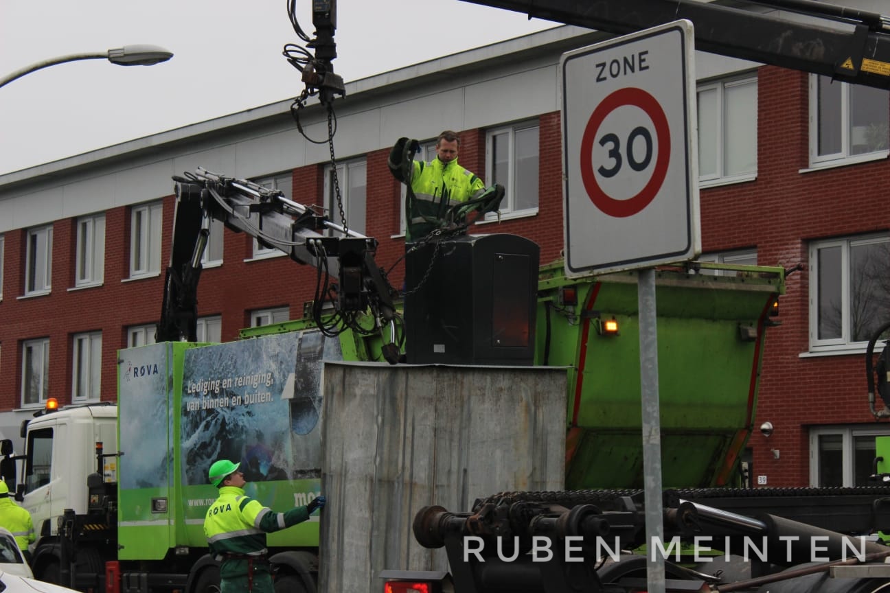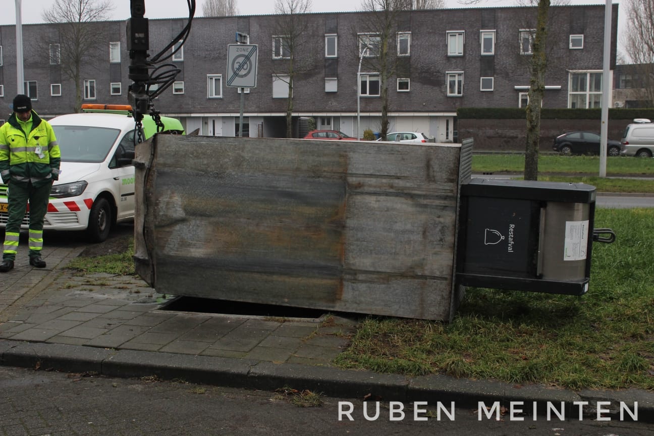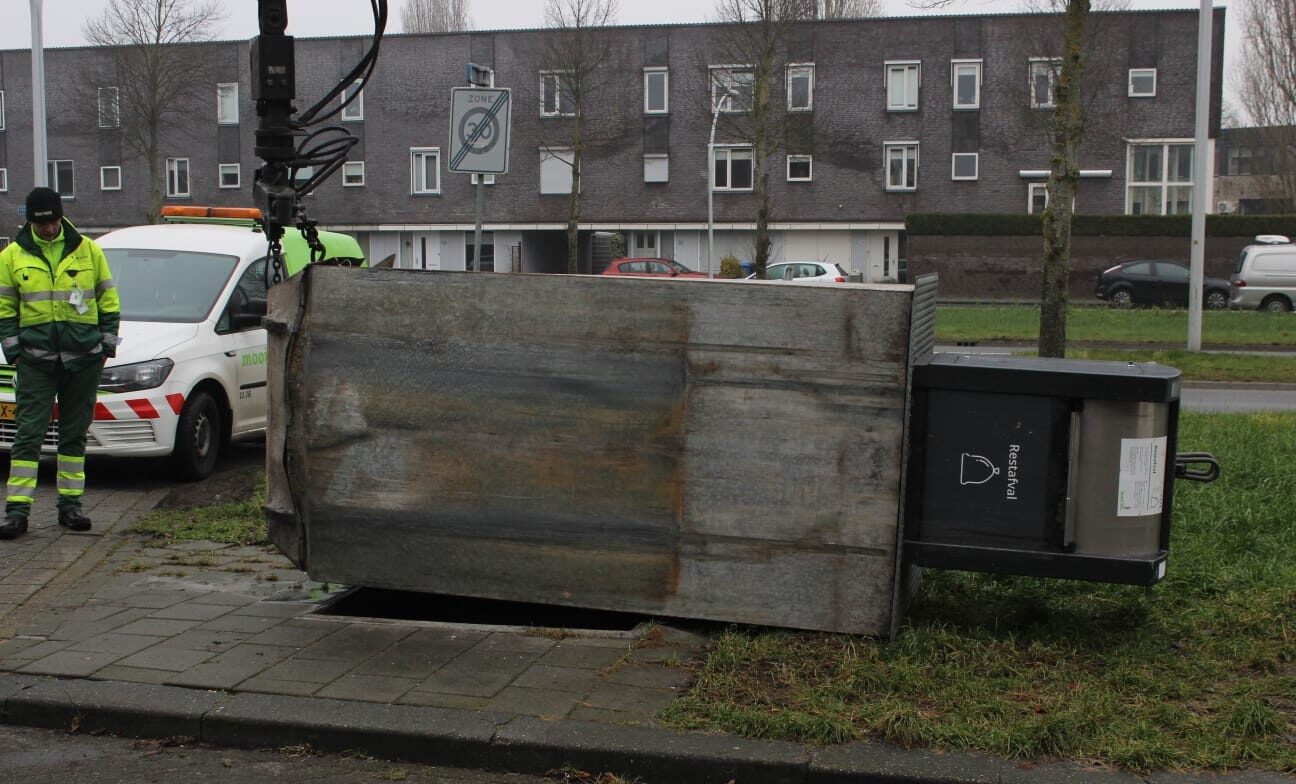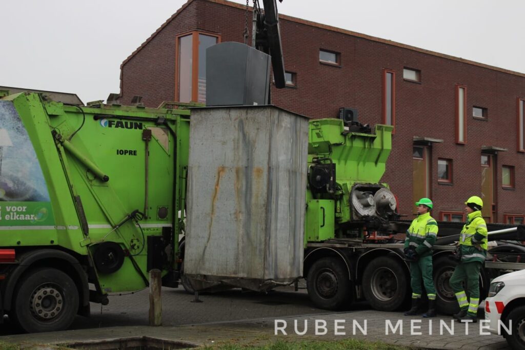 “Ik had de container naast de wagen op hoogte,” vertelt de chauffeur aan StadshagenNieuws. “Vervolgens begon de container langzaam te zakken, terwijl ik niets deed.” Kort daarop viel de container met een luide knal op de grond. Daarbij raakte een personenauto beschadigd.