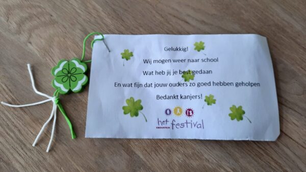 Om te vieren dat de school weer open is, kregen de 700 leerlingen van Het Festival vandaag allemaal een lekkere kanjer-stroopwafel mee naar huis. Met een lief briefje voor de leerling en ouders, omdat zij, samen met de leraren, zo hun best hebben gedaan.