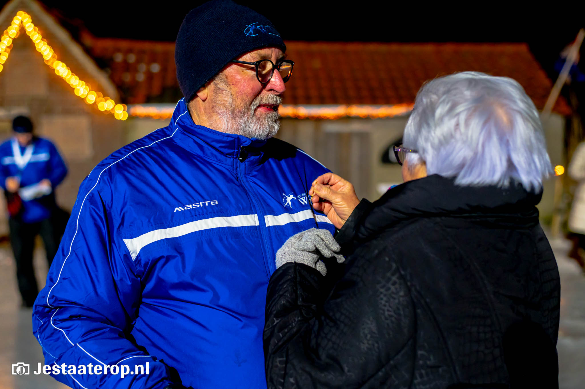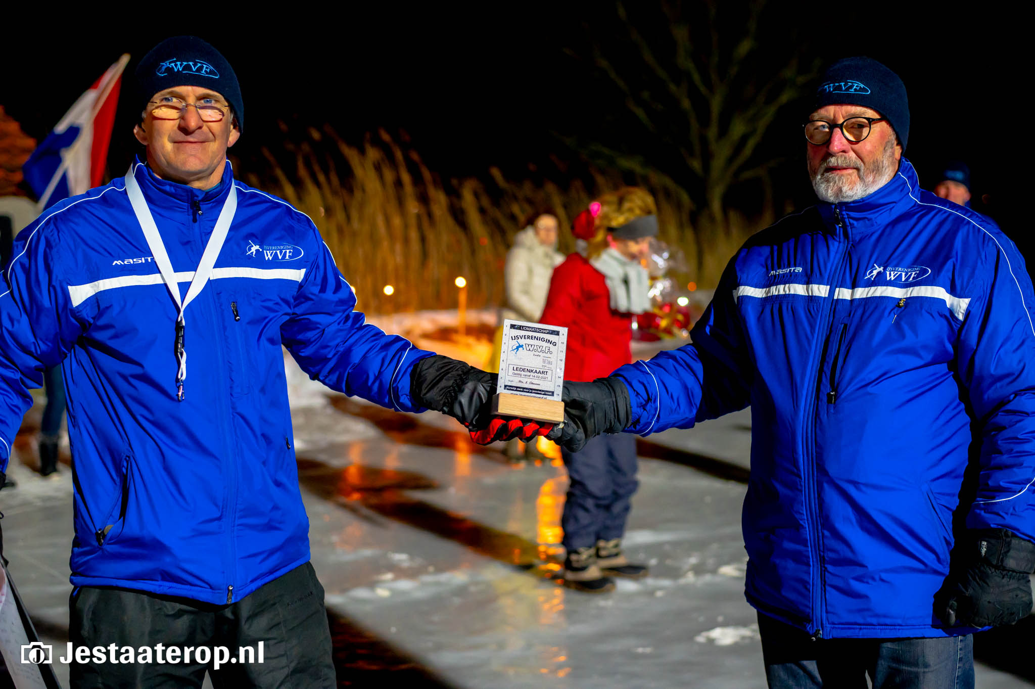 In het laatste uur van de geopende ijsbaan nam Rob Ruijsch, voorzitter van IJsvereniging WVF, het woord om Klaas te bedanken voor zijn inzet. Op de vraag hoeveel gaten Klaas in 40 jaar in het ijs heeft geboord, moest hij het antwoord schuldig blijven, maar het zullen er heel veel zijn geweest. Iets minder vaak -maar gezien de reacties vaak genoeg- waren de keren dat hij met een nat pak thuis kwam. De vrouw van Klaas mocht hem het speldje voor zijn erelidmaatschap opspelden en uit handen van Rob ontving hij het levenslange lidmaatschap van de ijsvereniging.