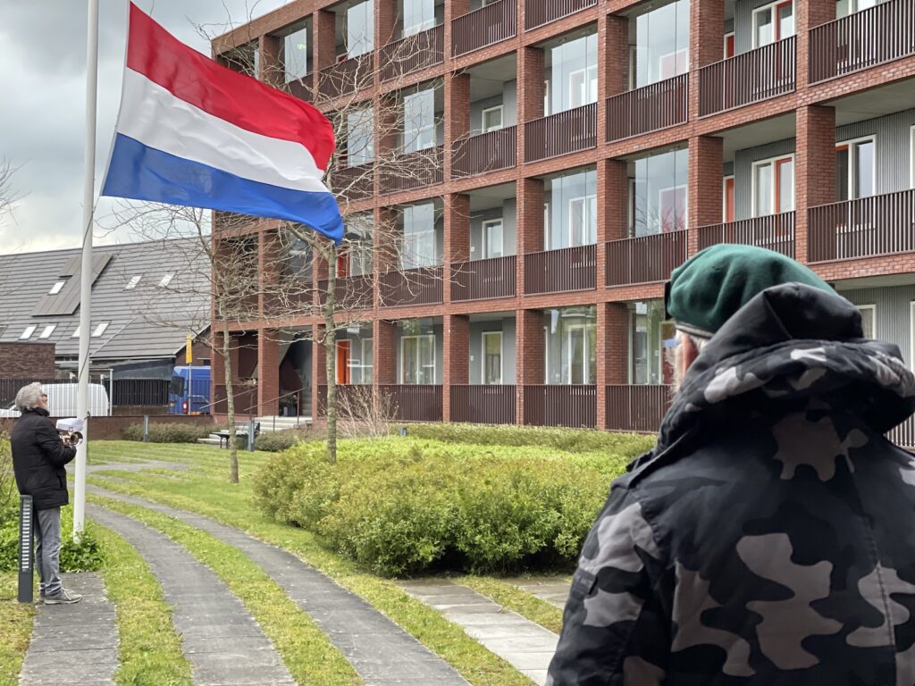 De aanwezige wijkgenoten zongen twee coupletten mee tijdens het Wilhelmus, waarna de korte herdenkingsplechtigheid werd beëindigd.