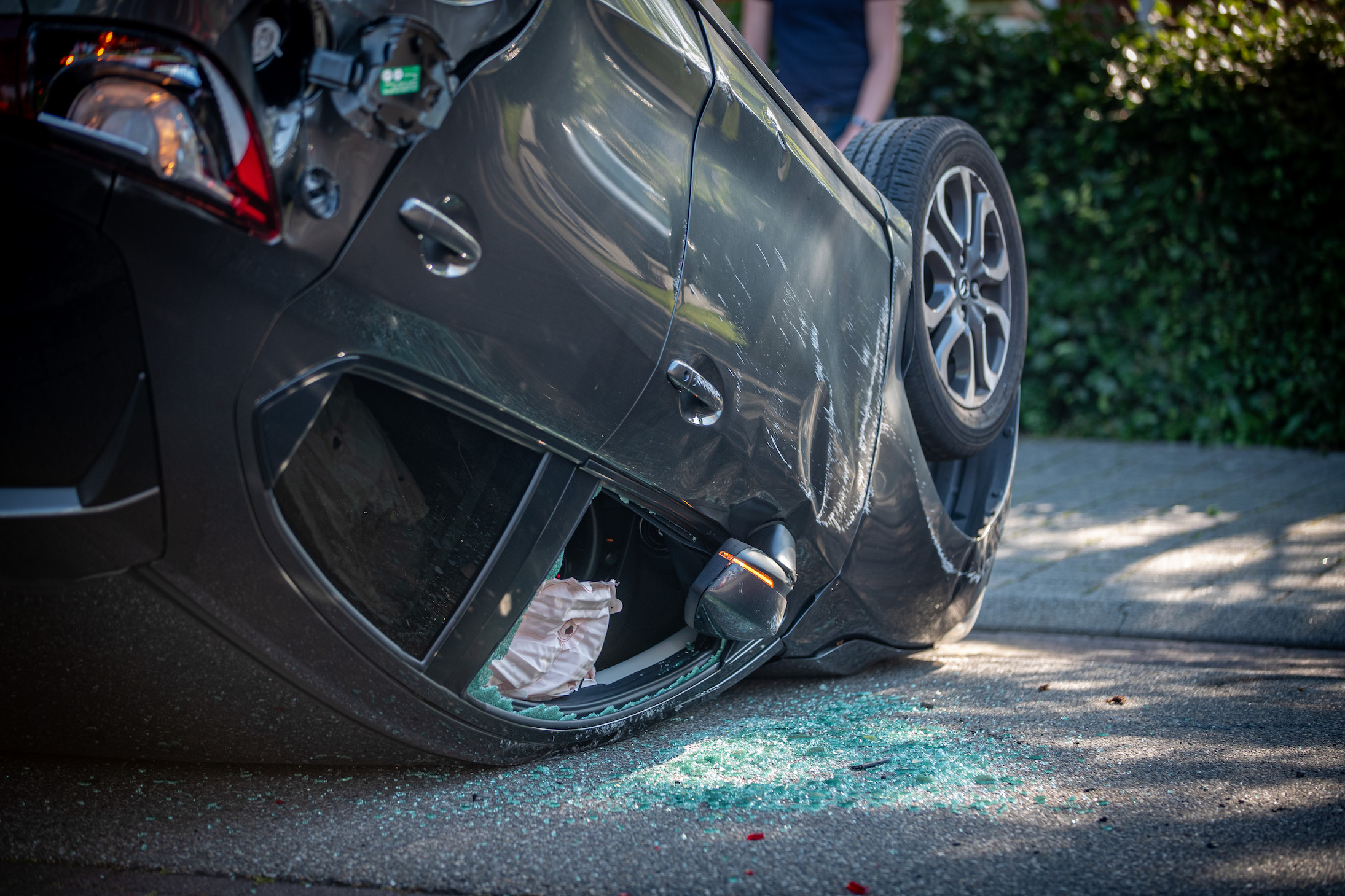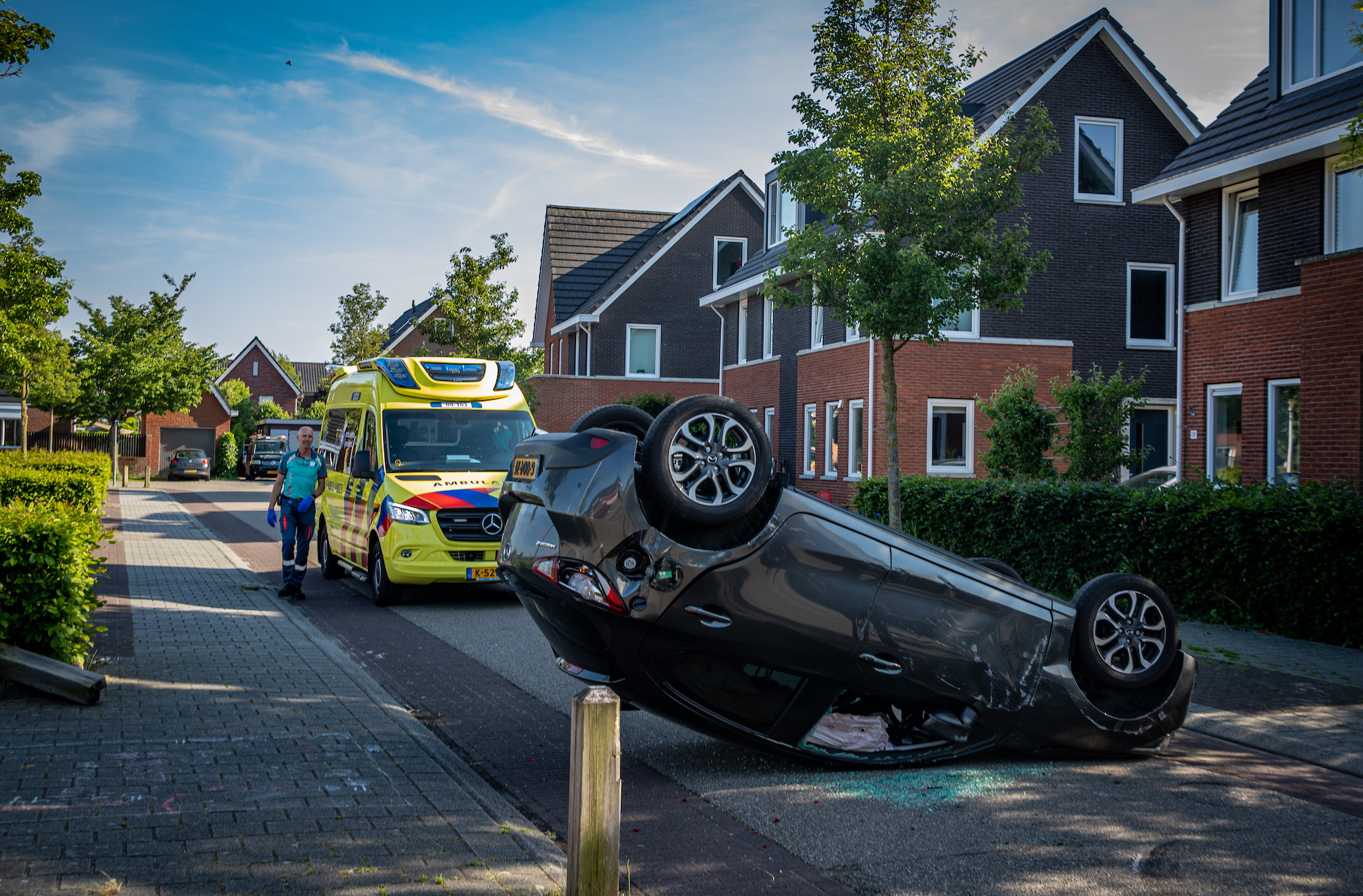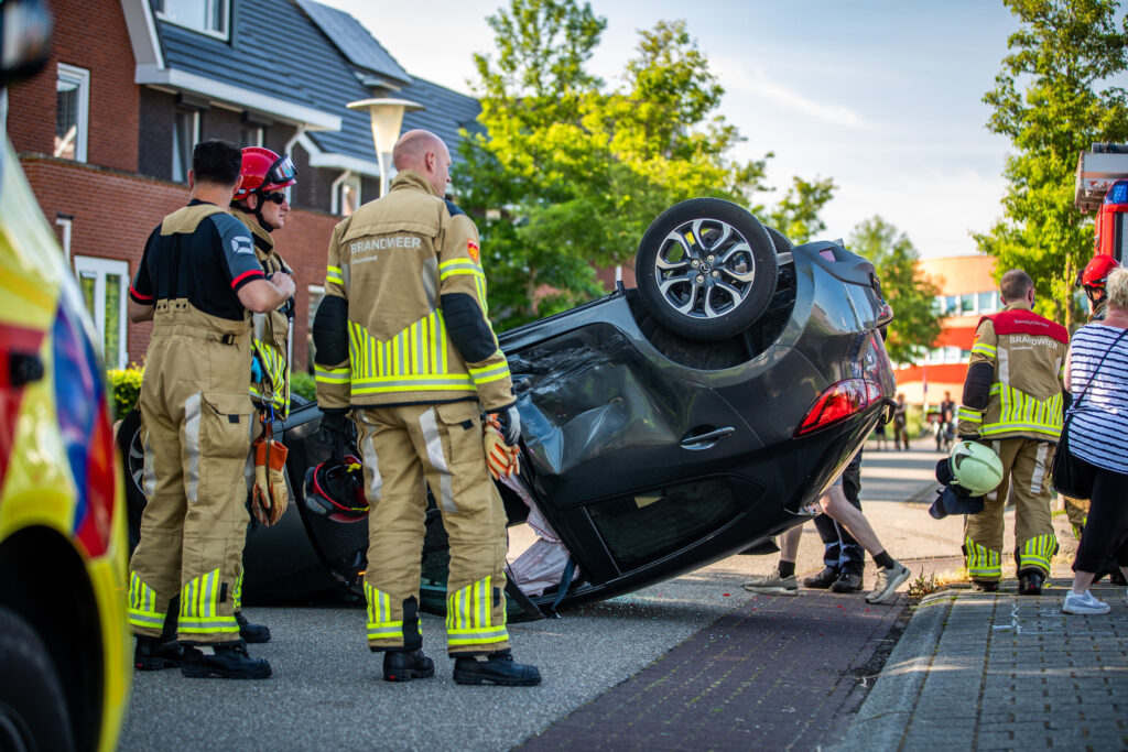 Een opmerkelijk ongeval in Stadshagen op donderdagavond. Een auto is bij een lichte botsing volledig op de kop beland op de Buckhorstlaan. De inzittenden kwamen gelukkig met de schrik vrij.