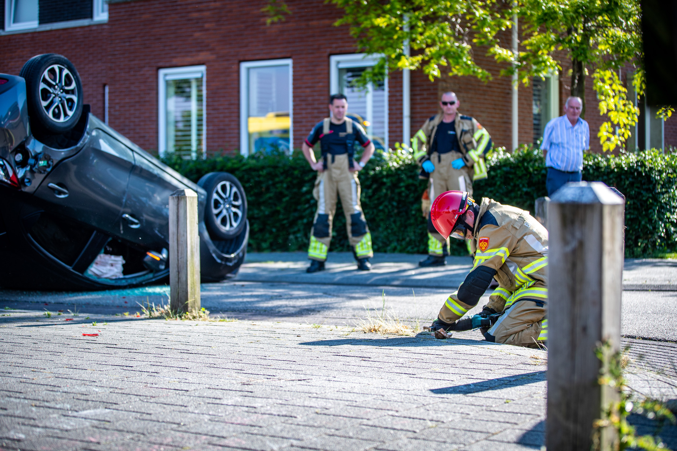 Naast de auto die op z’n kop lag, bleek er ook een houten paaltje in de bocht te zijn versplinterd.