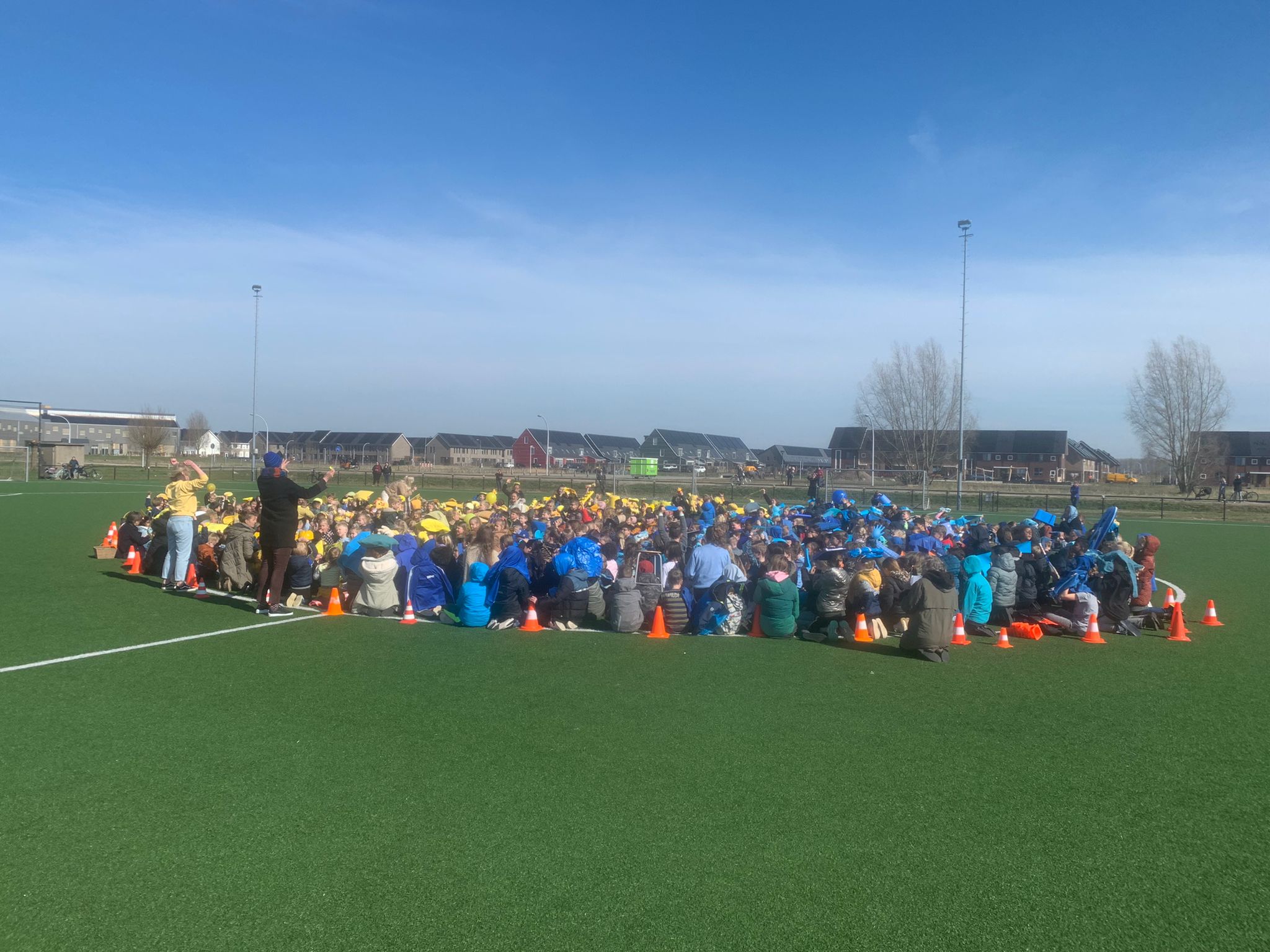Op IKC Het Festival is woensdag 16 maart een actieweek gestart. Alle leerlingen vormen samen een hart in de kleuren van de Oekraïnse vlag op het veld van CSV’28. De leerlingen van groep 1 t/m 4 in de kleuren geel, de leerlingen van groep 5 t/m 8 in de kleuren blauw. Met behulp va een drone is het hart van boven gefilmd. De komende week wordt geld ingezameld door inzamelen van lege flessen, spelletjesmiddag op vrijdagmiddag op het plein en een online collectebus.