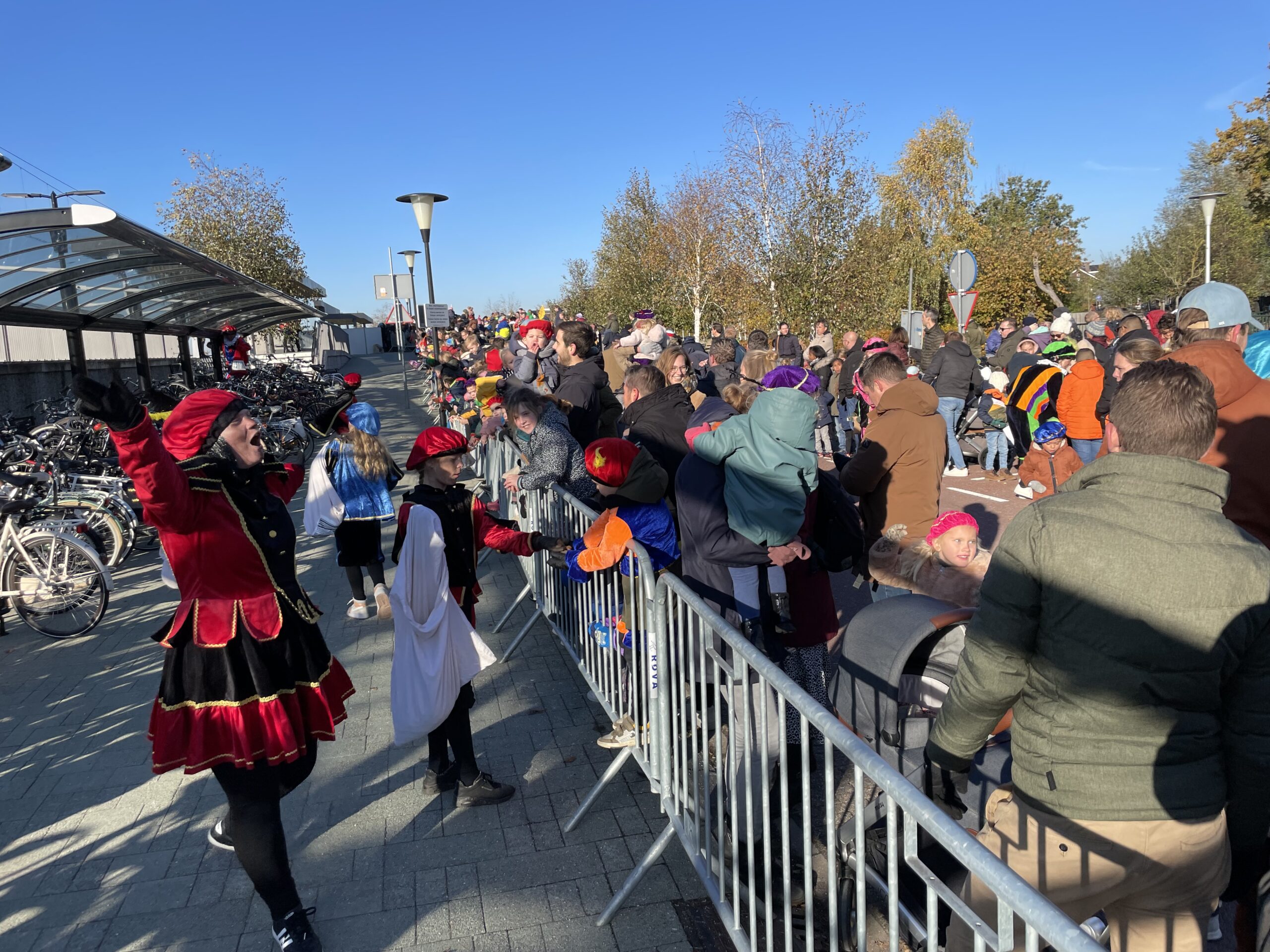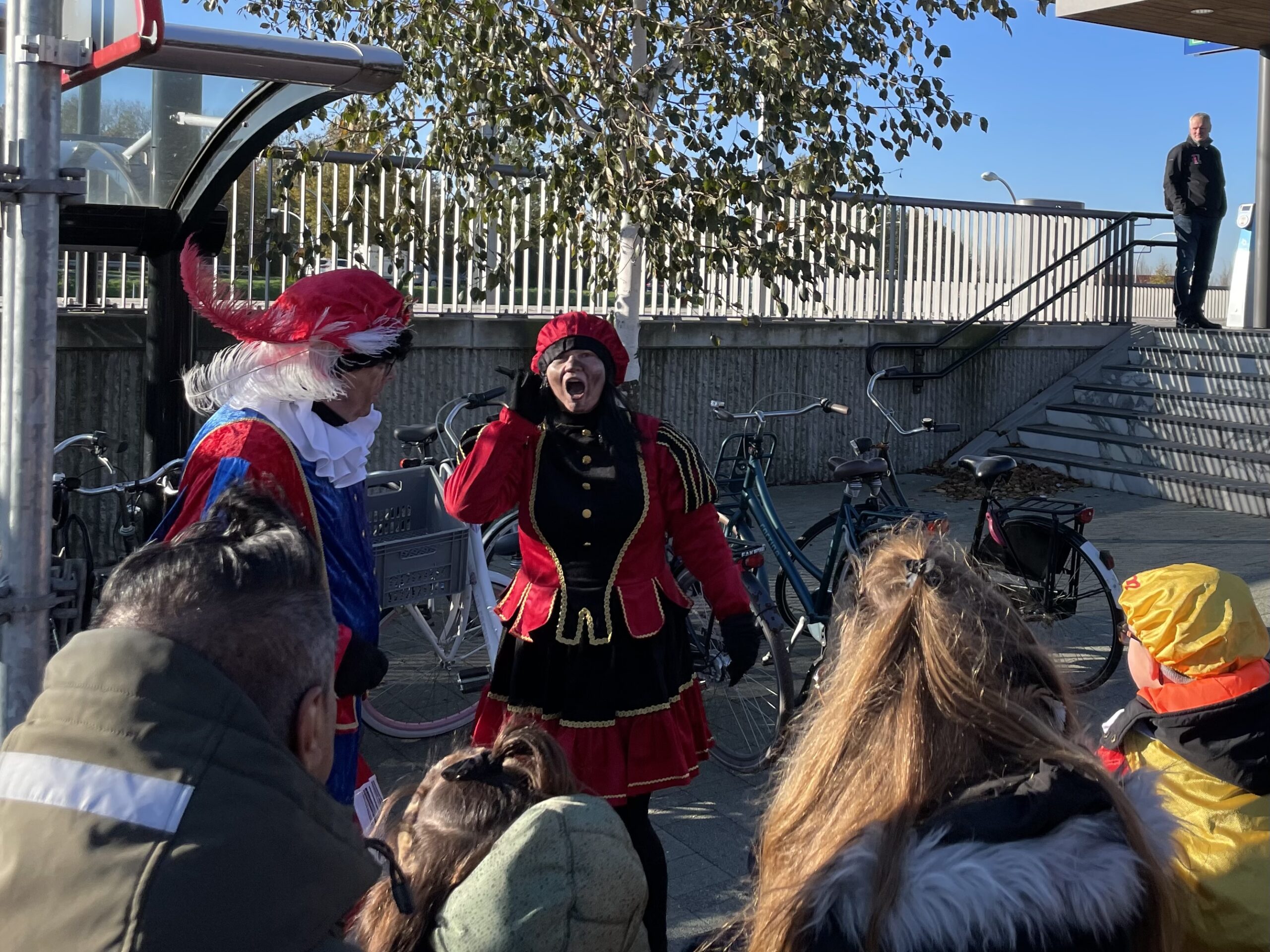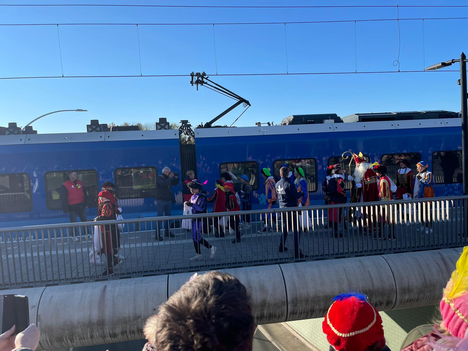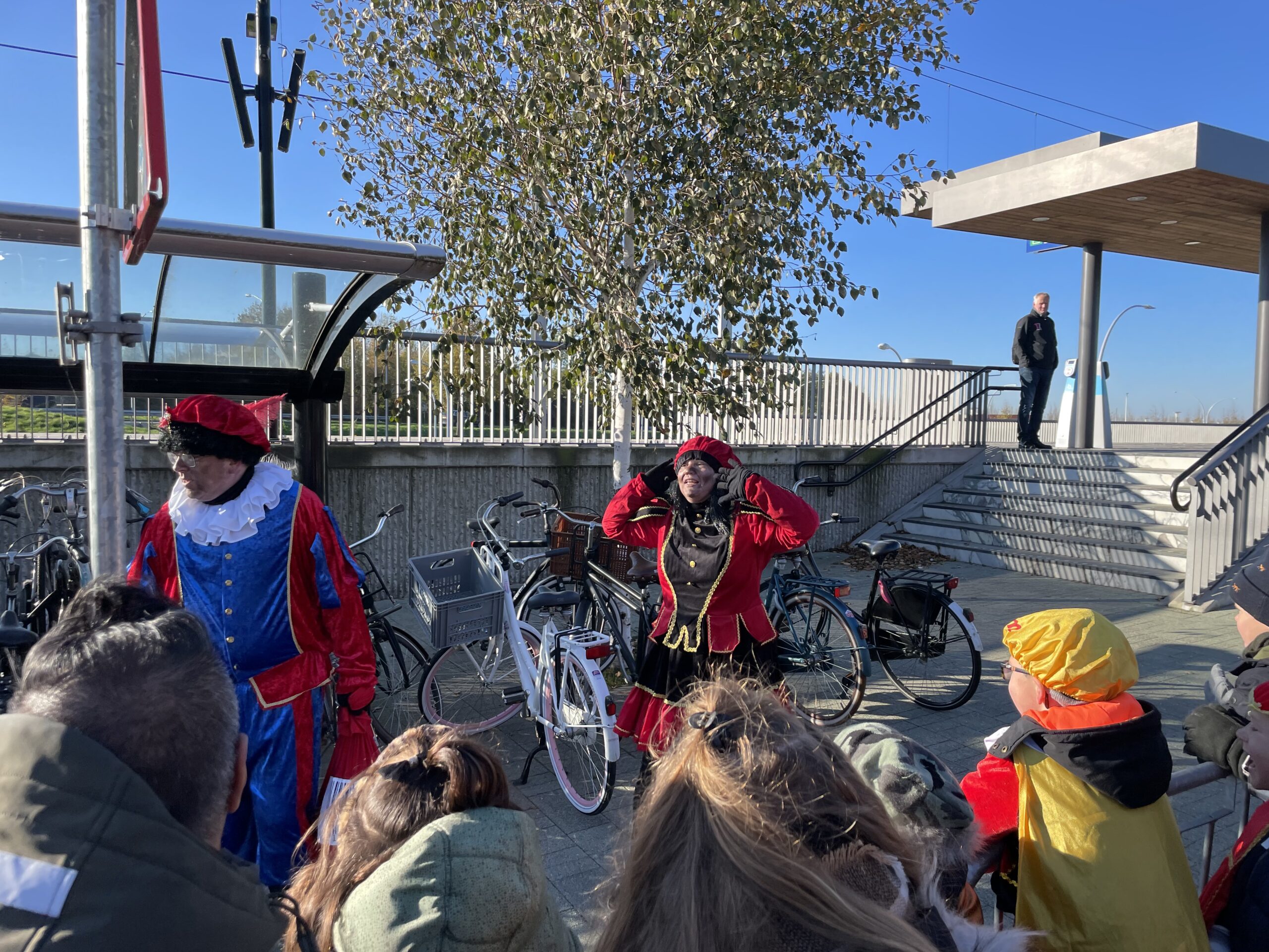 Een aantal pieten waren alvast vooruit gekomen, en zorgen voor een gezellige sfeer met volop pepernoten. Tegen het middaguur arriveerde de Goedheiligman per trein. Een feestelijk onthaal volgde, met een rondrit per tuktuk langs Park de Stadshoeve naar het winkelcentrum.