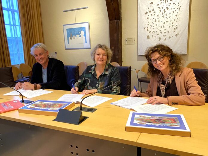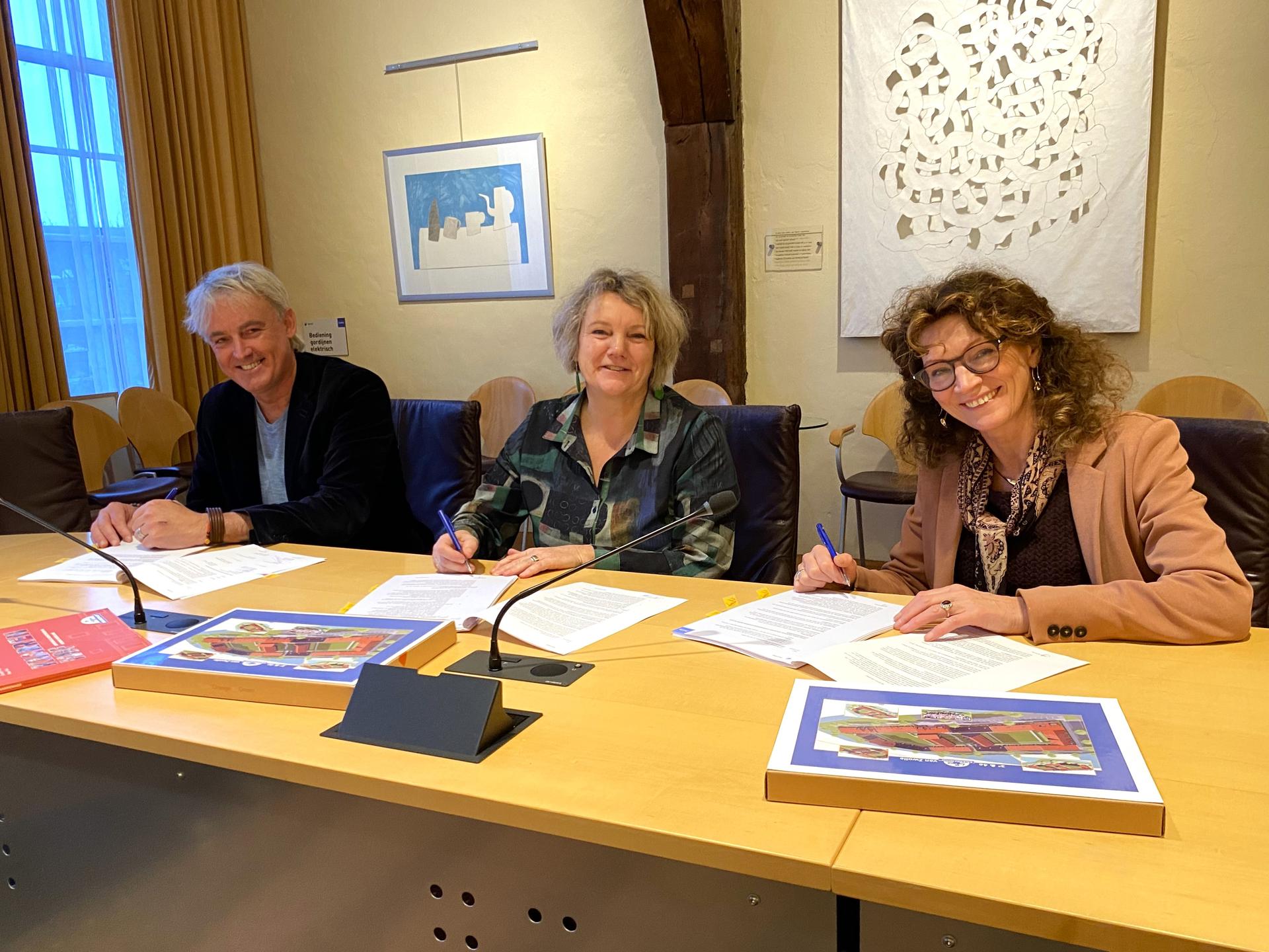Op de foto v.l.n.r.: Peter Prak (directeur van De Knarrenhof), Monique Schuttenbeld (wethouder gebiedsontwikkeling Stadshagen) en Wiepke van Erp Taalman Kip (directeur-bestuurder van SWZ) ondertekenen de reserveringsovereenkomst voor de grond van De Veecatenhof.