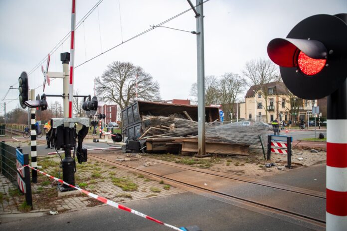 Het treinverkeer tussen Zwolle en Kampen is nog de hele ochtend gestremd, nadat een vrachtwagen zijn lading verloor op een spoorwegovergang. De wagen vervoerde metaalschroot en bouwafval in een bak op een aanhanger. Die raakte los in de bocht, waarna de bak met inhoud precies op het spoor kantelde.