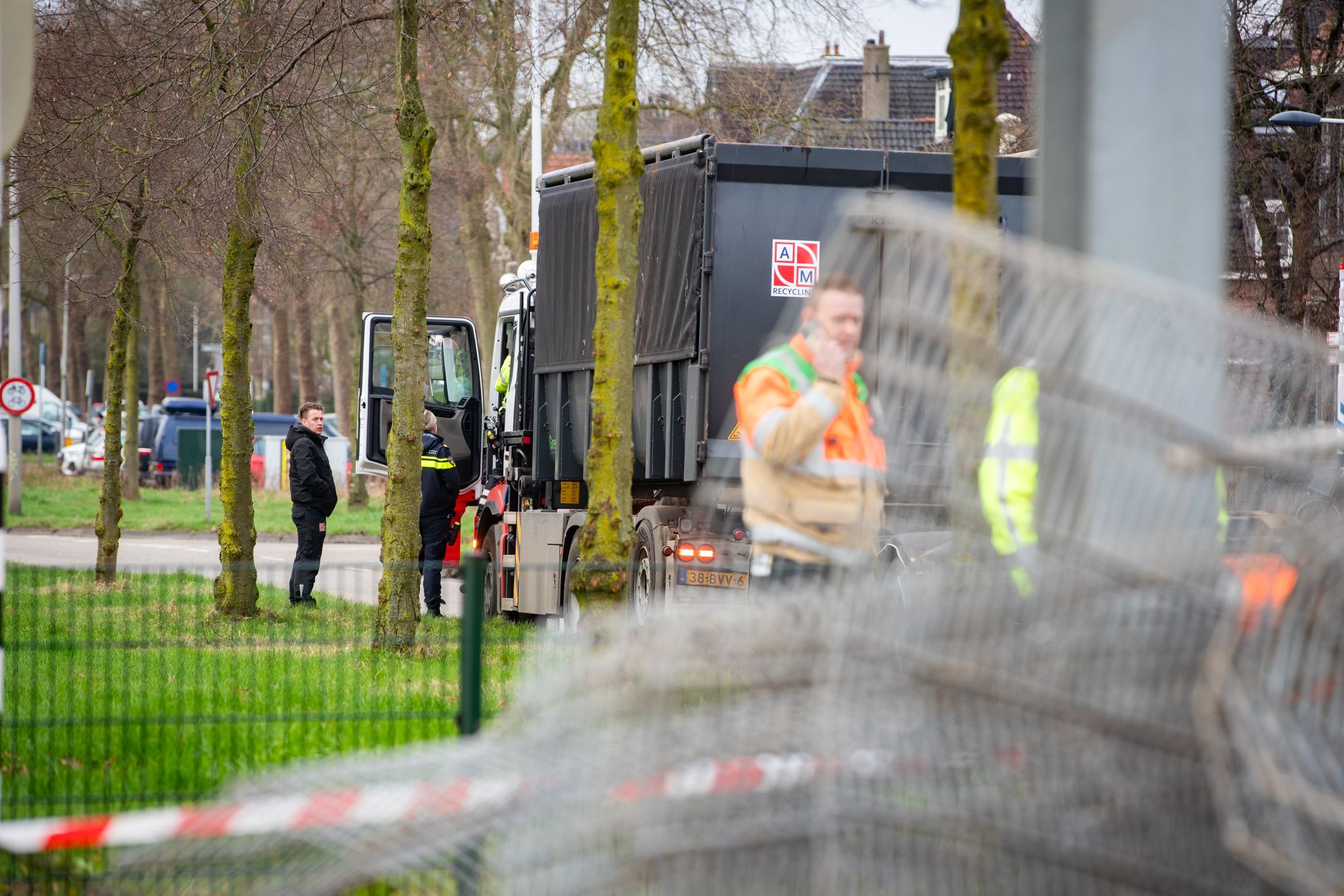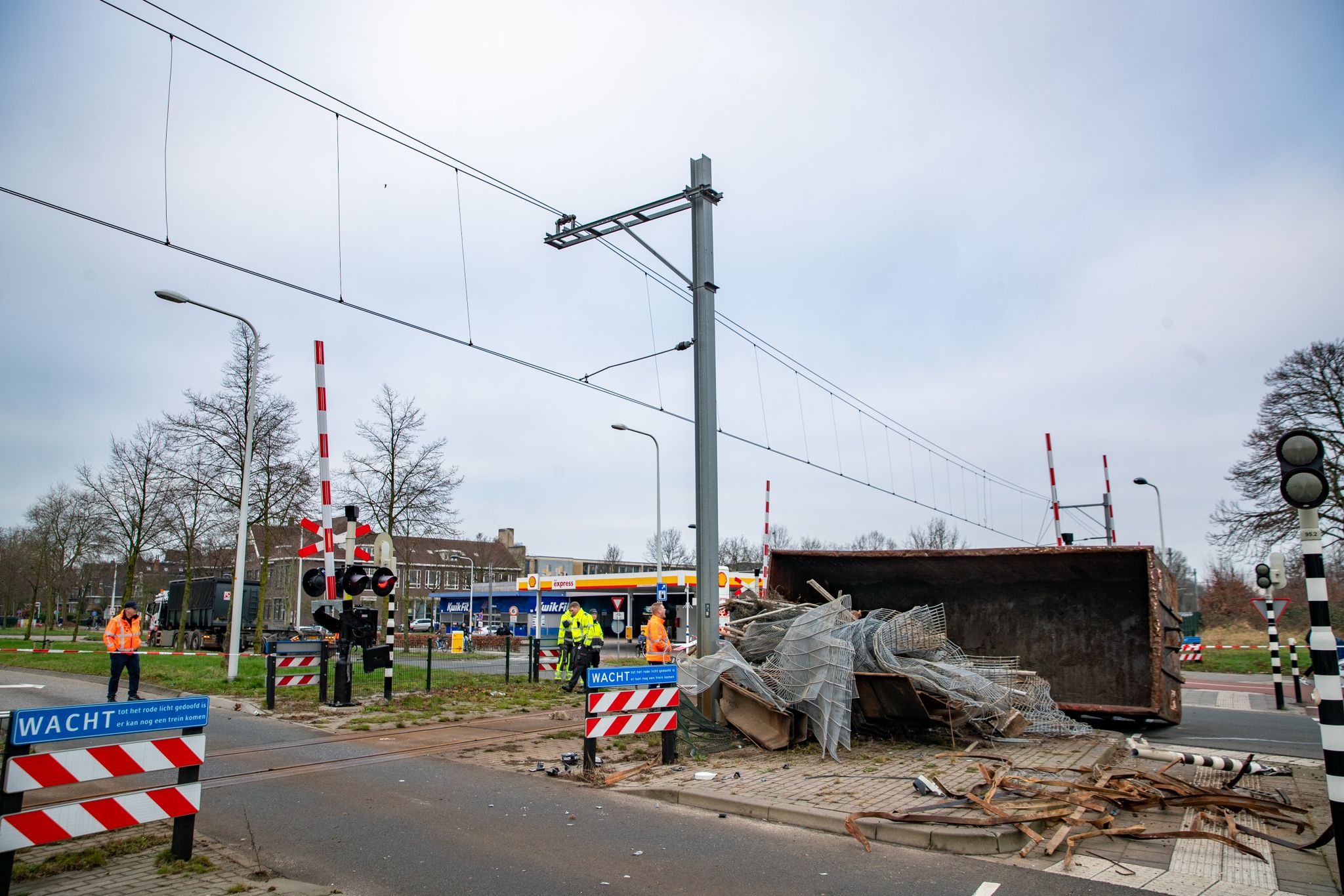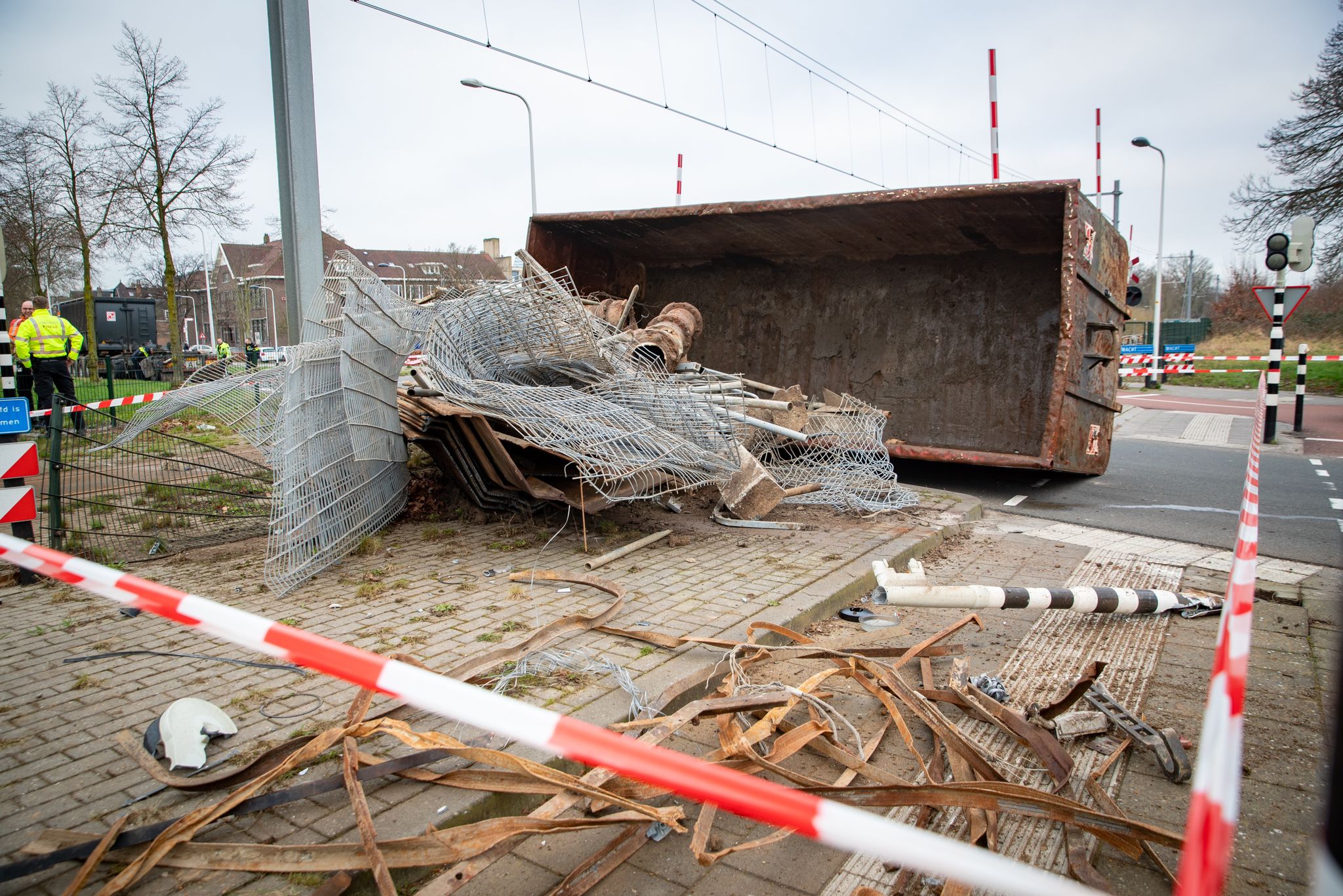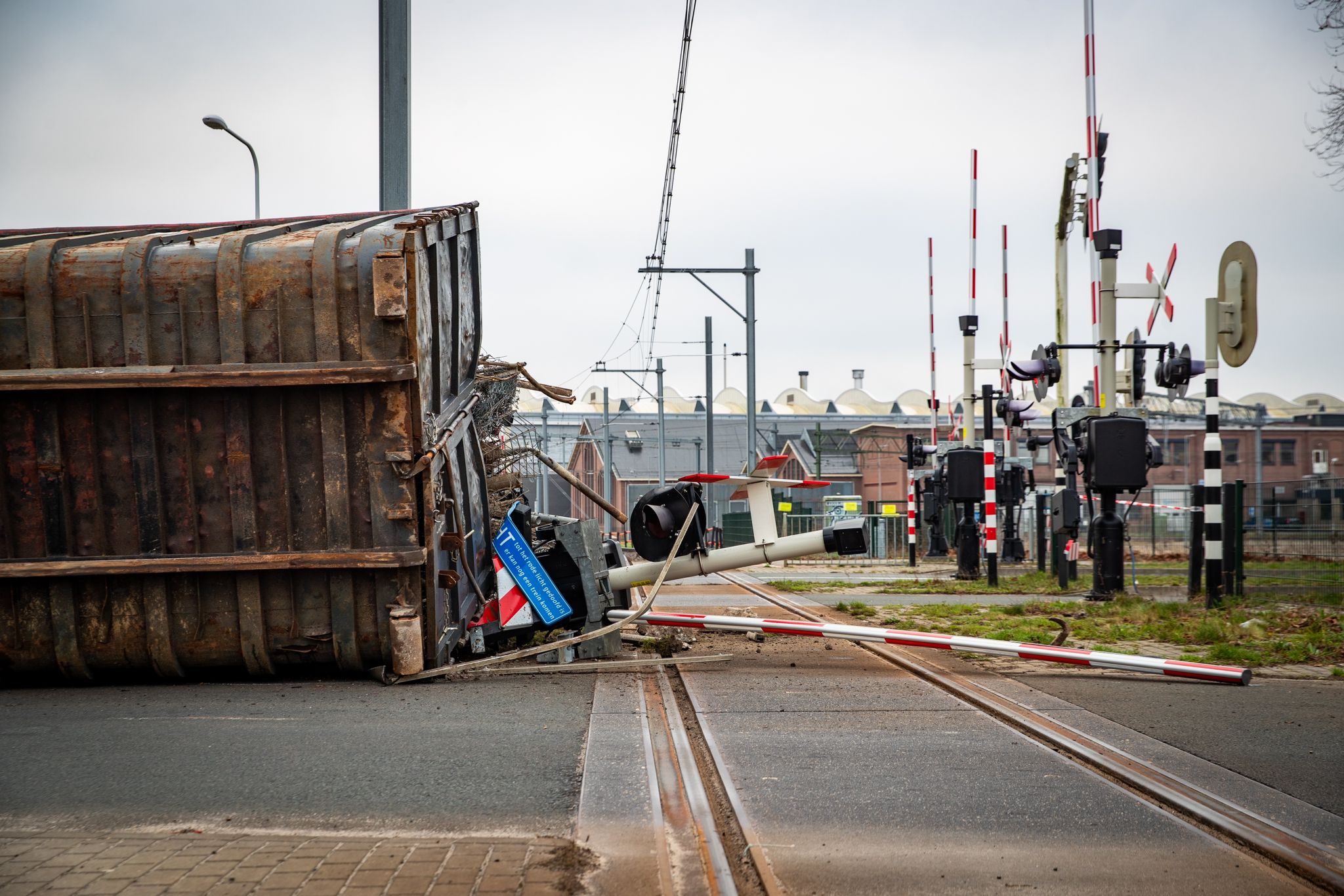 Het ging dinsdagochtend rond 8:00 uur mis op de kruising van de Nieuwe Veerallee met de Willemskade. De bak heeft in zijn val ook een slagboom van de spoorwegovergang kapot getrokken.