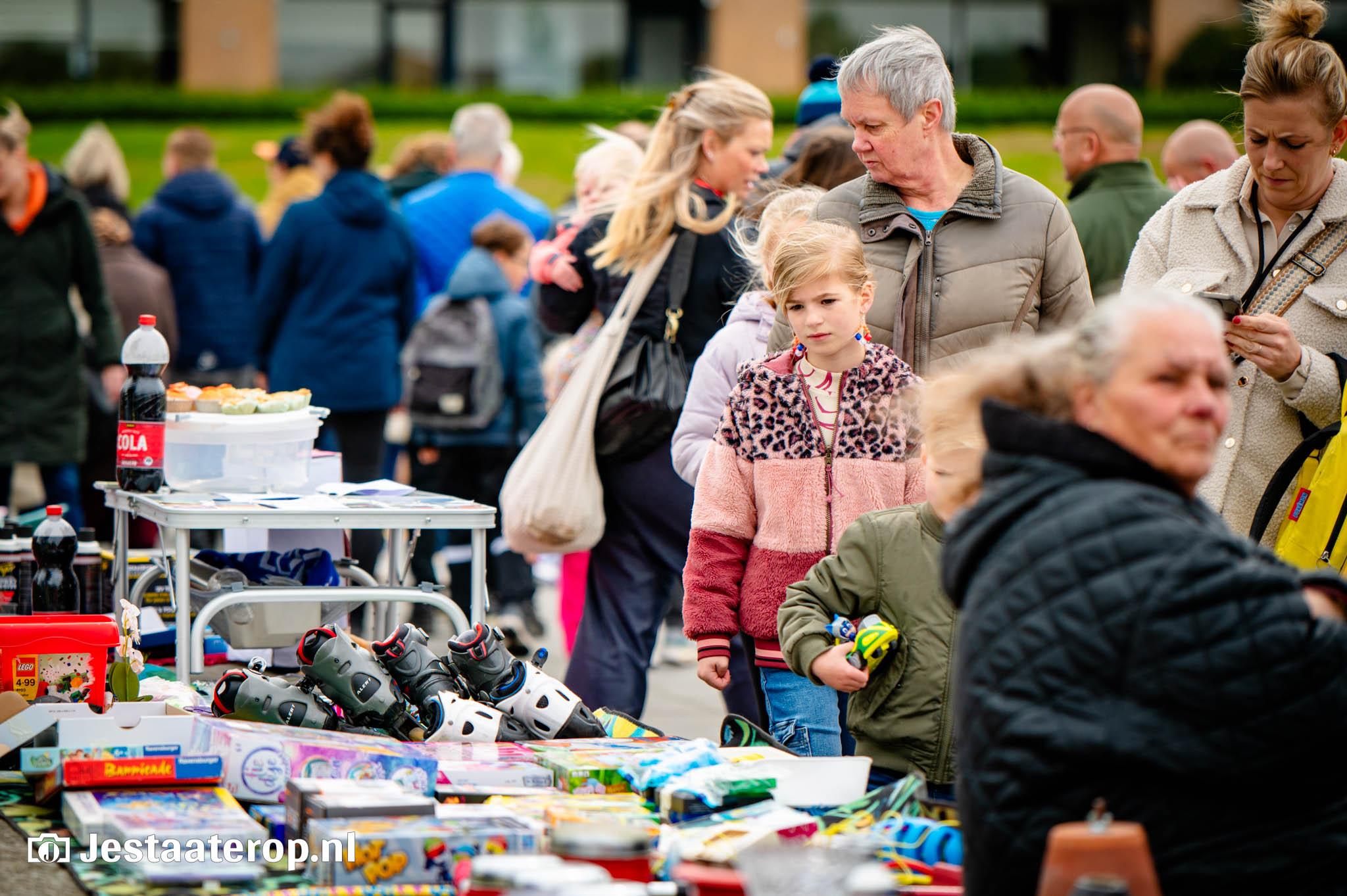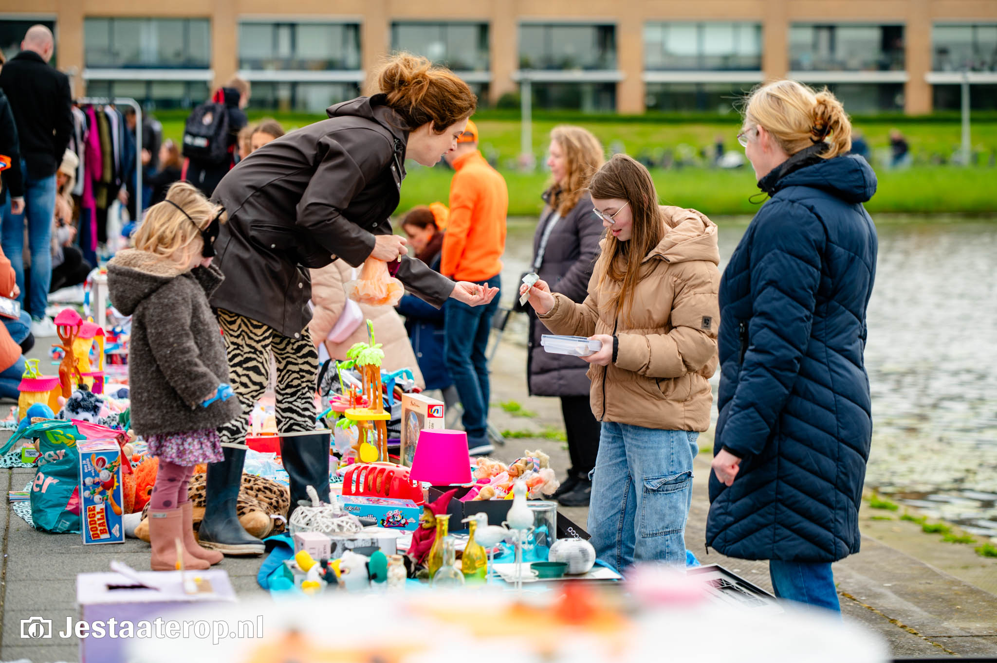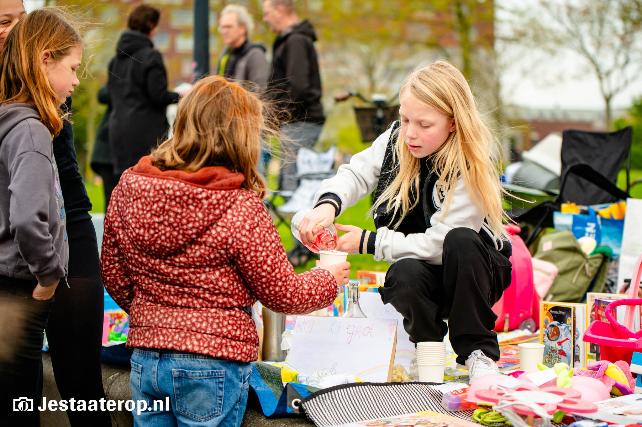 De kleedjesmarkt in het park bij het winkelcentrum van Stadshagen was zaterdag een groot succes. Langs alle paadjes en zelfs pal langs het water zaten kinderen – en volwassenen – met kleedjes met daarop spullen om te verkopen. En er werd goed gehandeld: kopers liepen soms zelfs met karren vol spullen over het terrein.