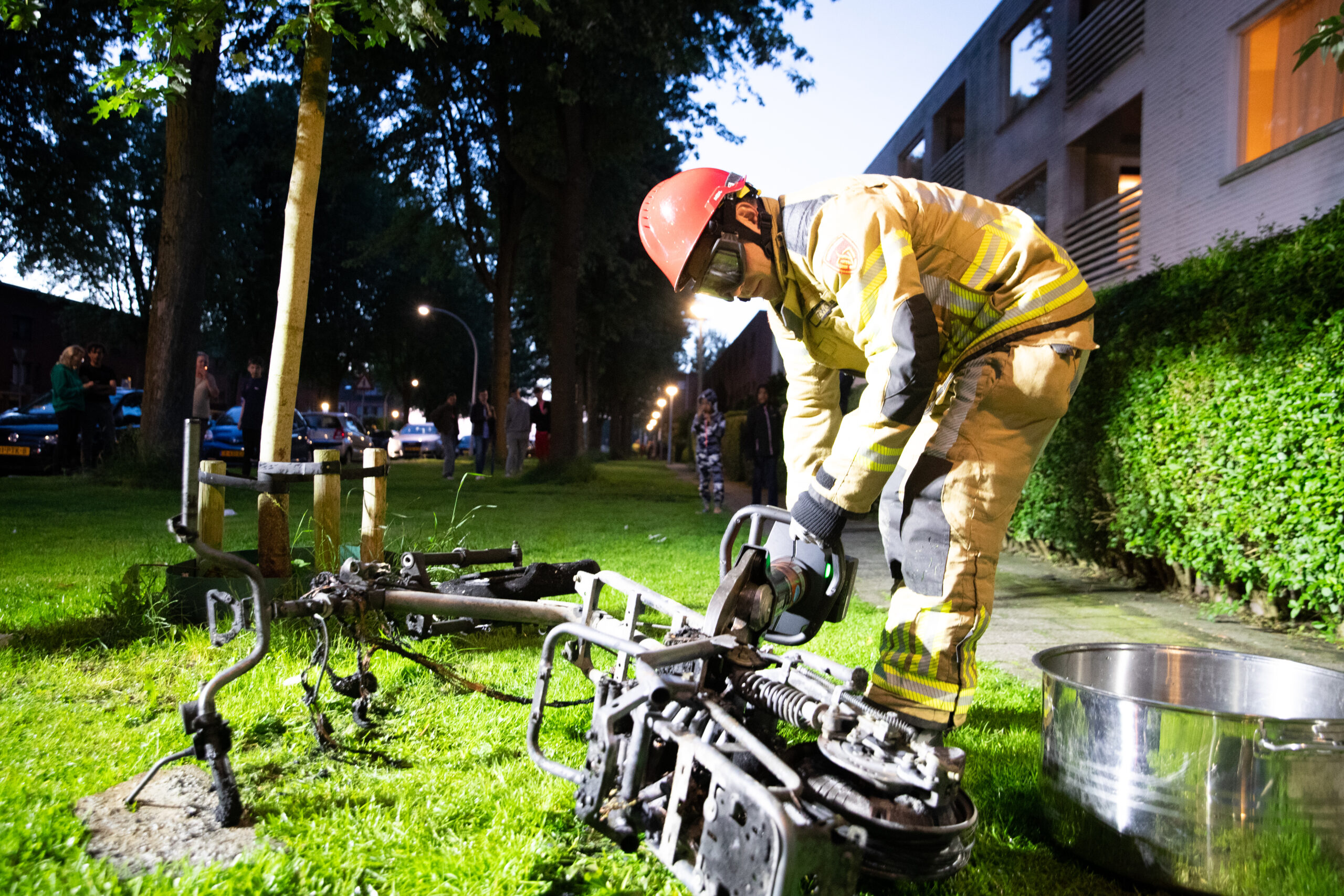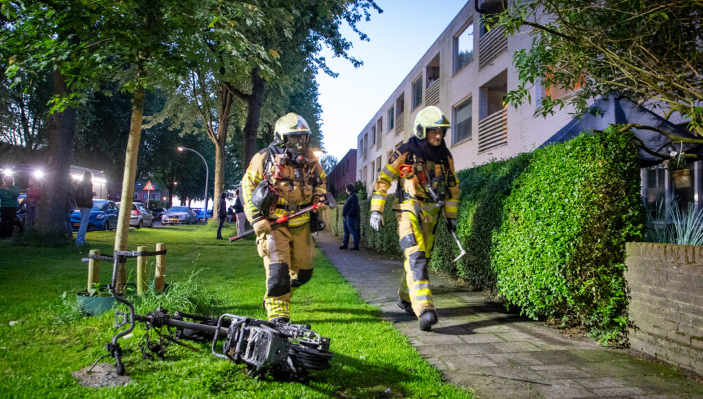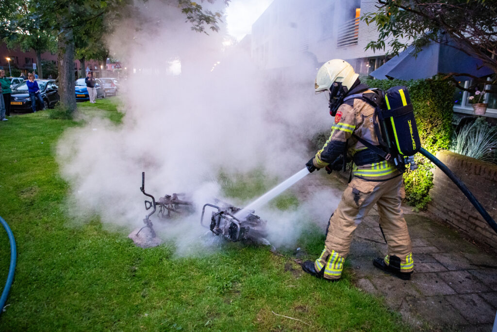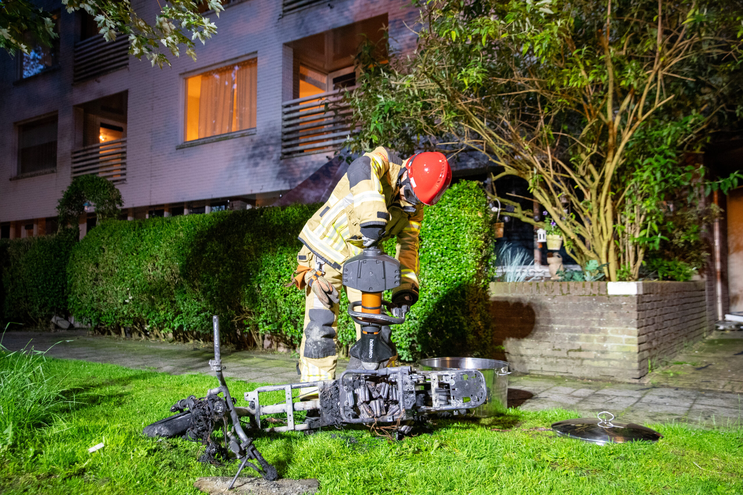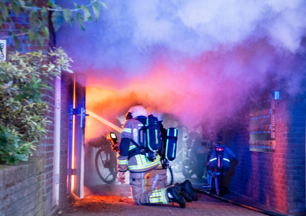 Na het blussen werden de accu’s uit de scooter geknipt om ze in een bak onder te dompelen. Zo wordt voorkomen dat het accupakket nog een keer in brand vliegt. De schuur en de bebouwing over de steeg heen hebben flinke rookschade opgelopen.