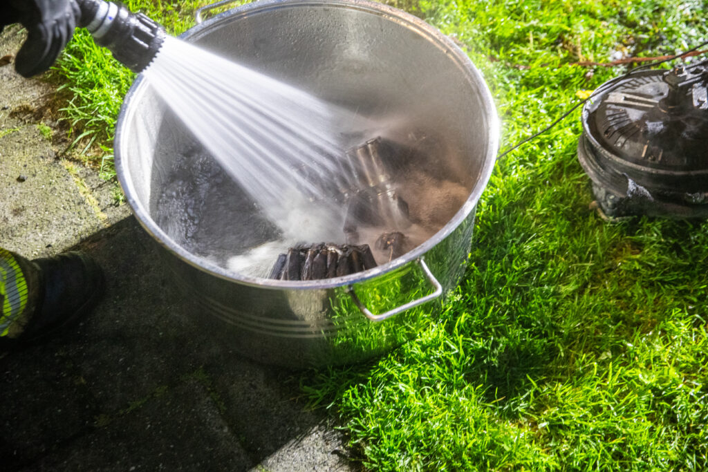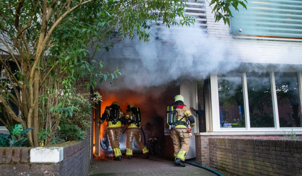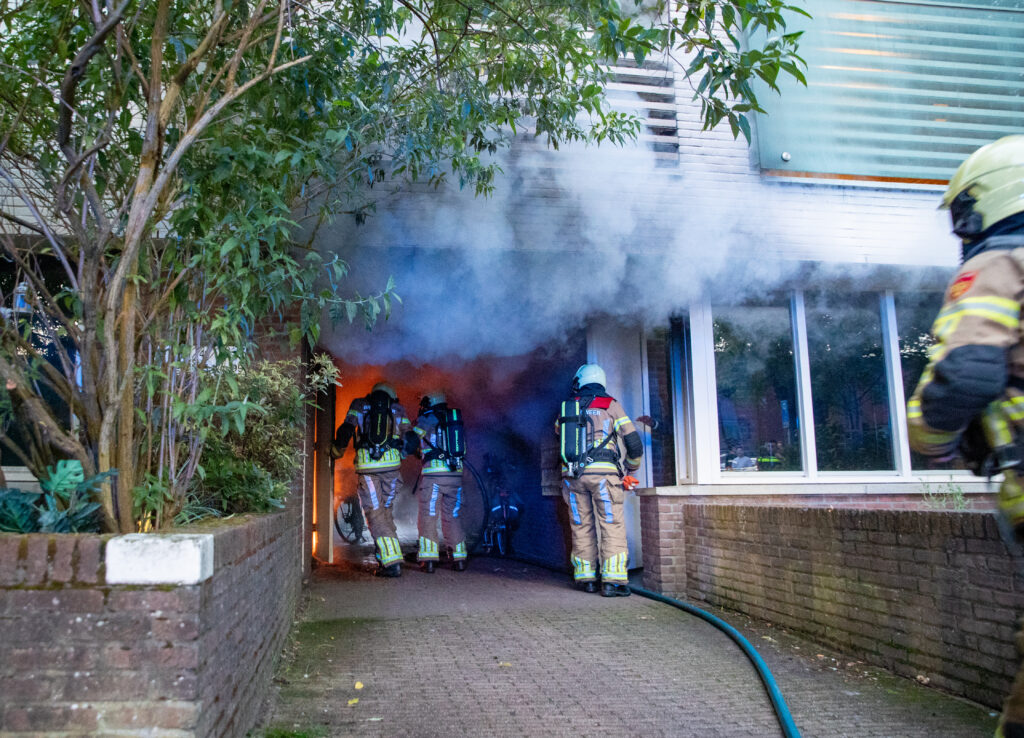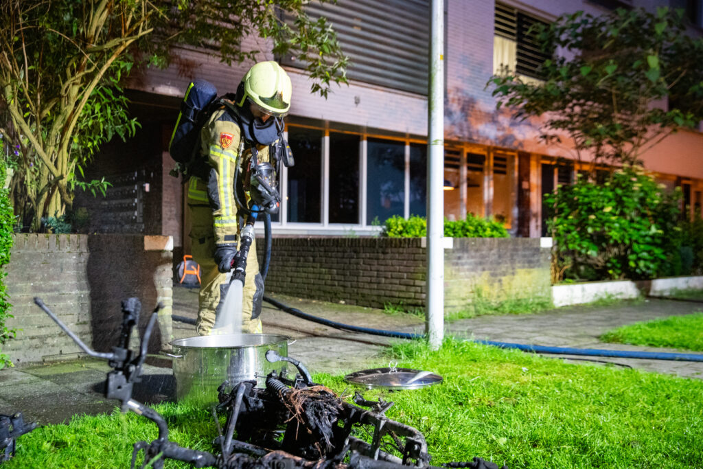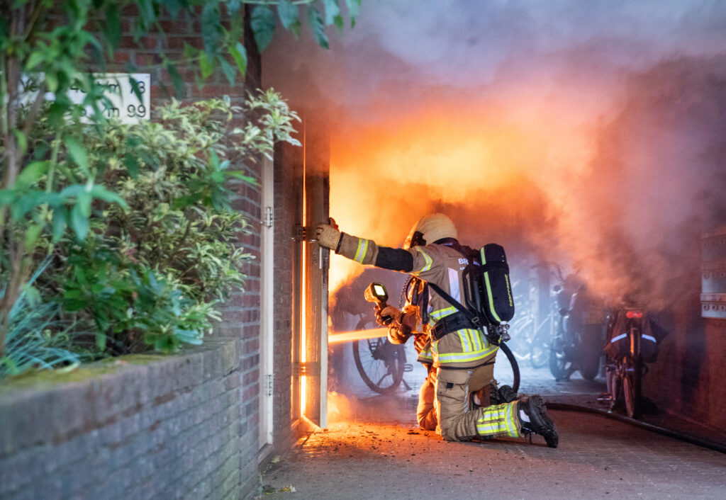 Na het blussen werden de accu’s uit de scooter geknipt om ze in een bak onder te dompelen. Zo wordt voorkomen dat het accupakket nog een keer in brand vliegt. De schuur en de bebouwing over de steeg heen hebben flinke rookschade opgelopen.