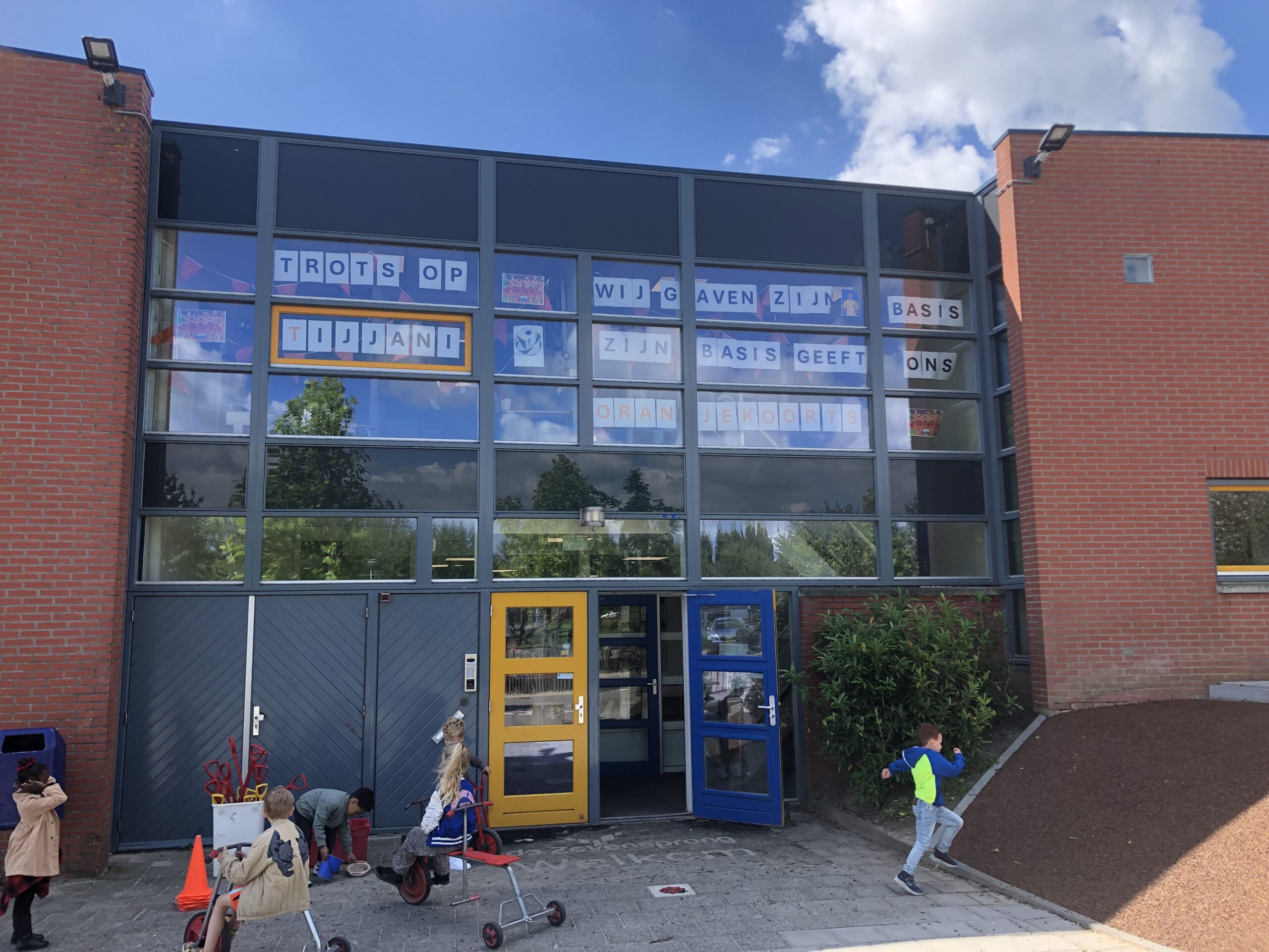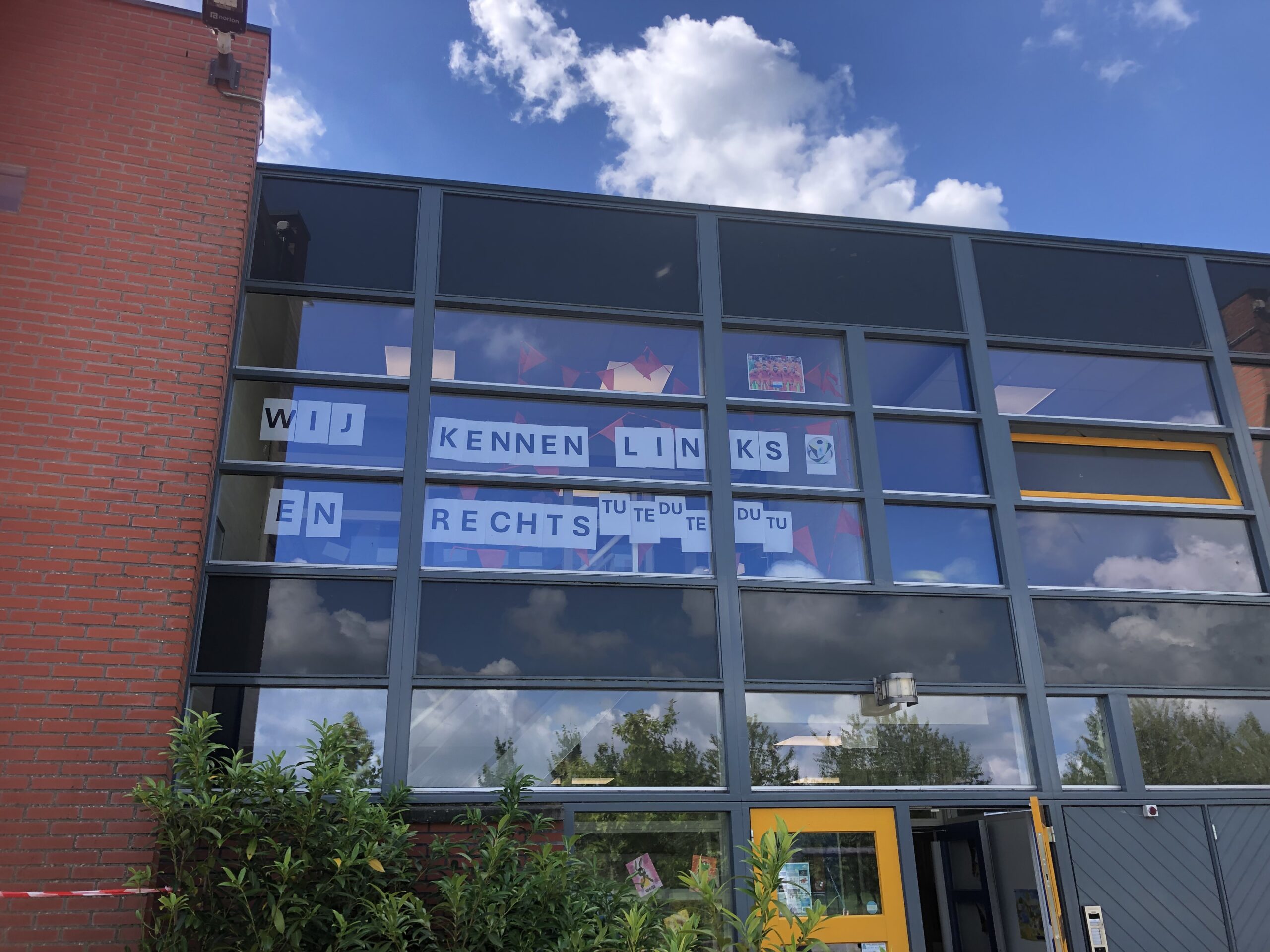 “Trots op Tijani!” Wij gaven zijn basis, zijn basis geeft ons oranjekoorts”, staat in grote letters gedrukt voor de ramen van de basisschool. En op de andere ramen staat “wij kennen links en rechts, tudududu” geschreven, verwijzend naar de hit die het oranjelegioen van links naar rechts swingend wereldwijd op de kaart zet.