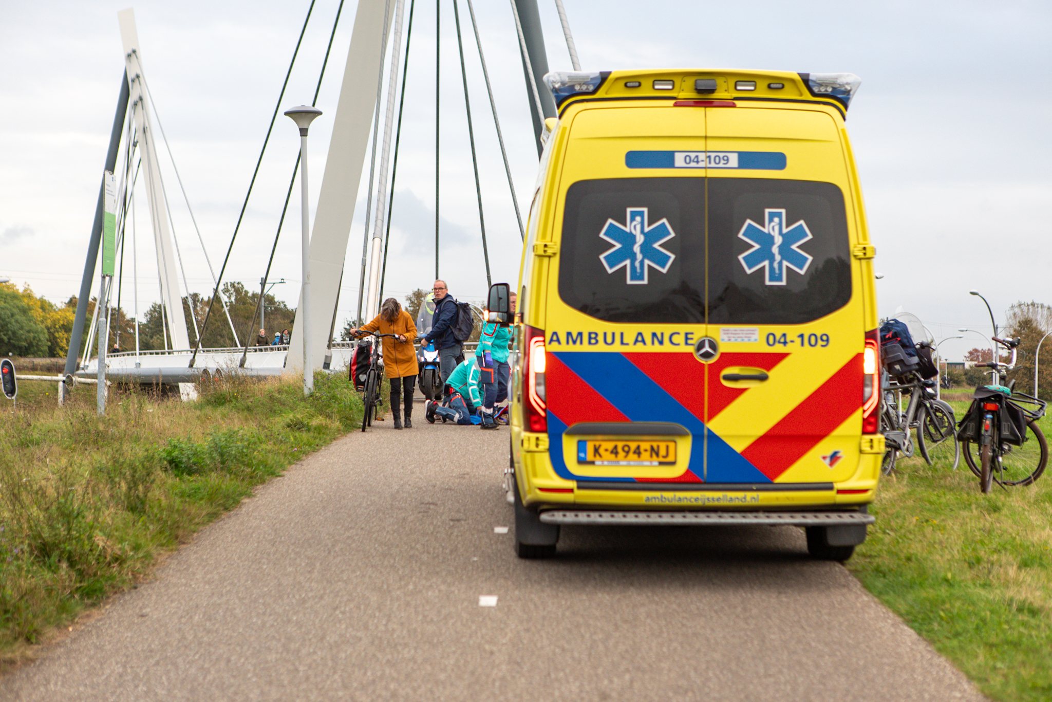Een fietsster is maandagmiddag gewond geraakt bij een ongeluk op de Westenholterbrug. Ze kwam hard ten val en heeft vermoedelijk een been gebroken.