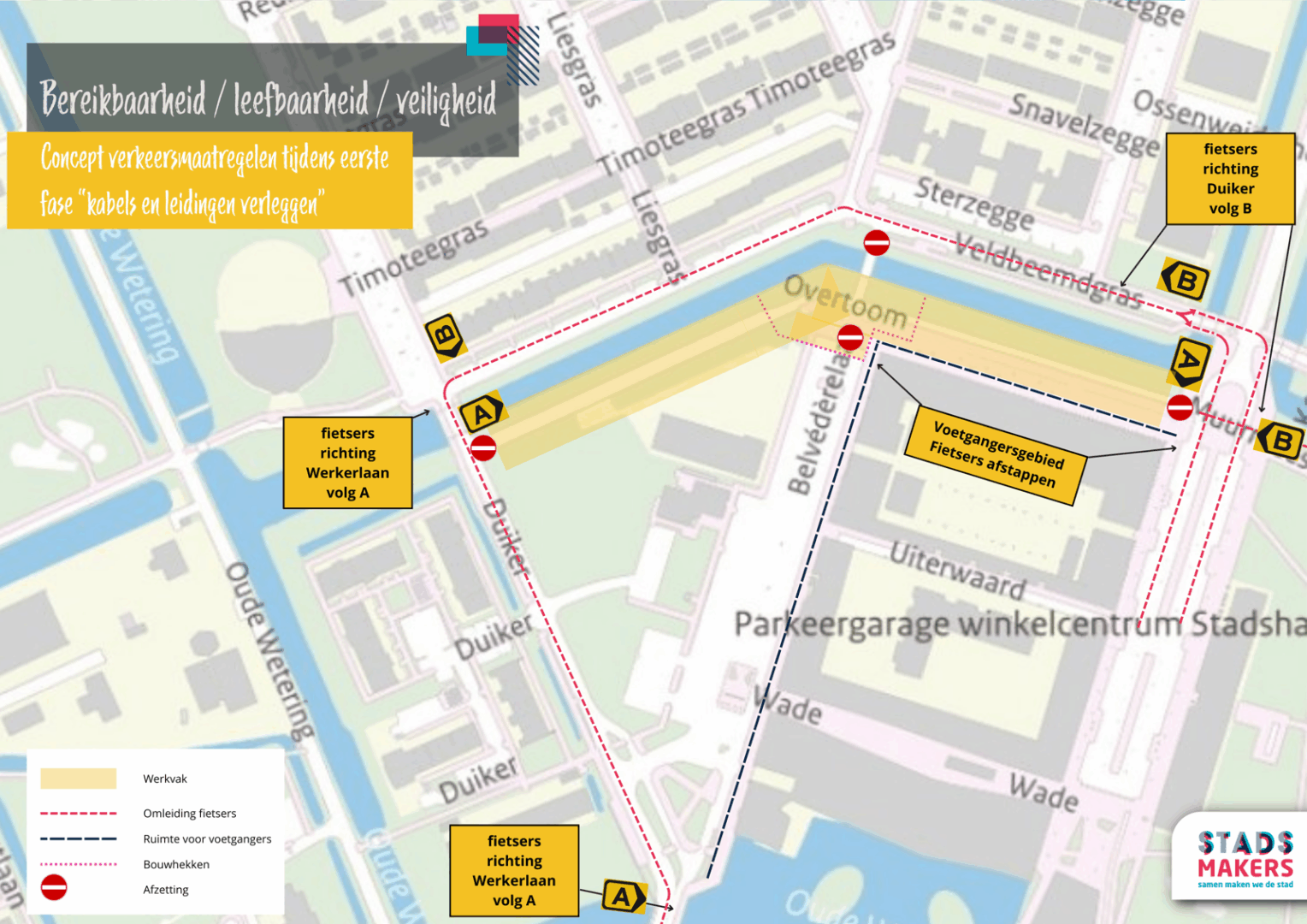 De Overtoom is afgesloten tussen de Duiker en de Werkerlaan. Ook de fiets- en voetgangersbrug tussen de Veldbeemdgras en de Overtoom is tot eind dit jaar buiten gebruik. Fietsers en voetgangers worden omgeleid via het Veldbeemdgras. Voor voetgangers blijft de Overtoom wel toegankelijk. Aan de noordkant van de Belvédèrelaan zijn enkele parkeerplaatsen verdwenen. De parkeergarage onder het winkelcentrum blijft bereikbaar.
