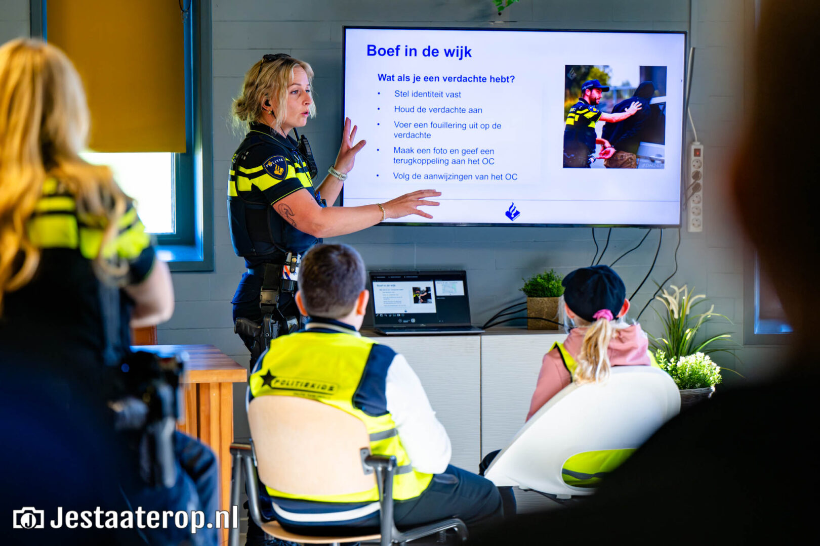 Onder begeleiding van politieagenten en studenten van Landstede gingen de Politiekids op zoek naar verdachten van een fietsendiefstal. De kids namen getuigenverklaringen af, spraken met de meldkamer via de portofoon en vonden uiteindelijk de fiets en de verdachten.