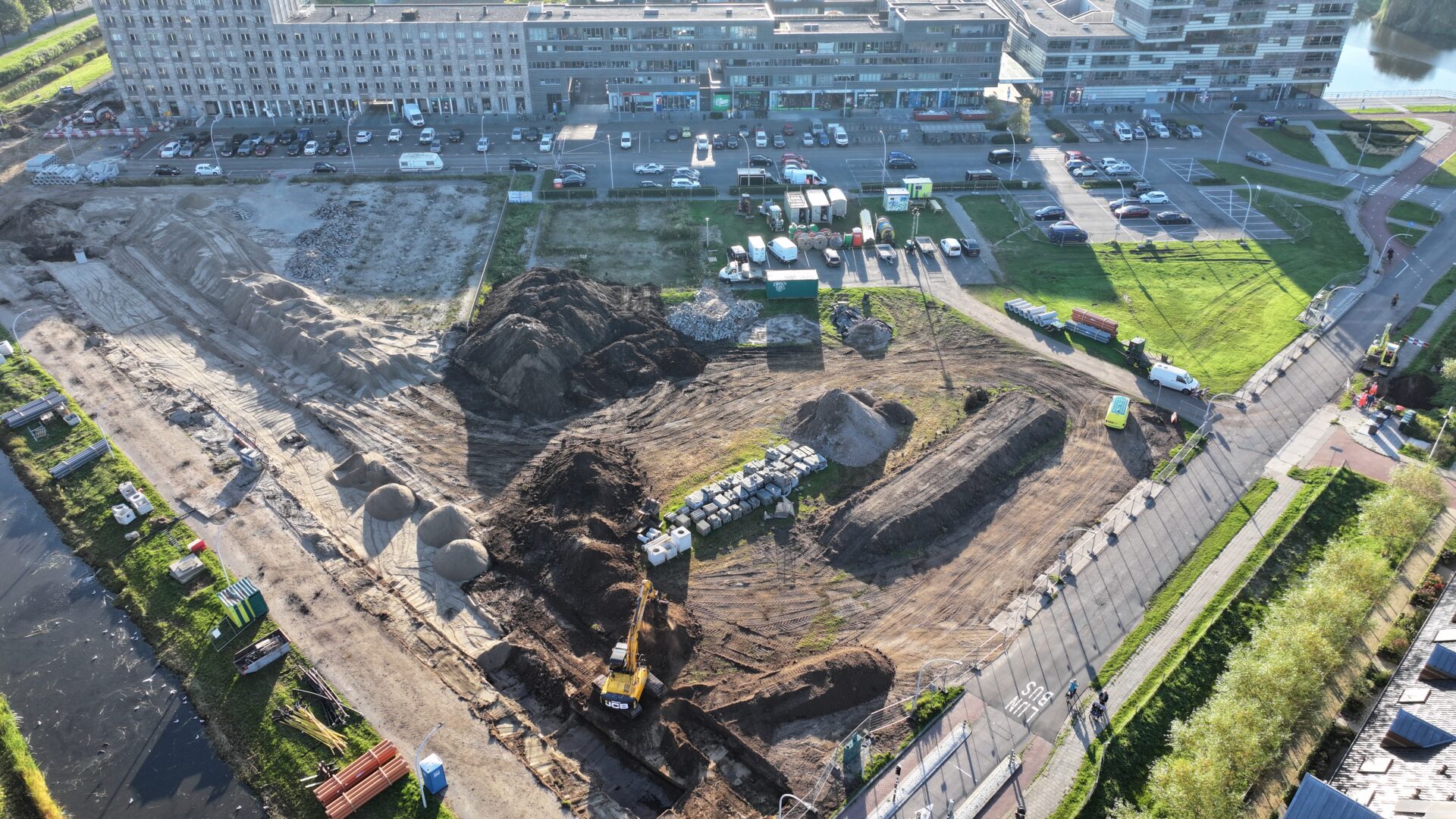 Na een maand zwoegen door grondwerkploegen tekent zich een duidelijke basis af voor het nieuwe winkelcentrum. Grote hopen zand, afgegraven delen grond en her en der paaltjes om grenzen te markeren: de plek waar vroeger een informatiecentrum en een school stond is niets meer te herkennen.