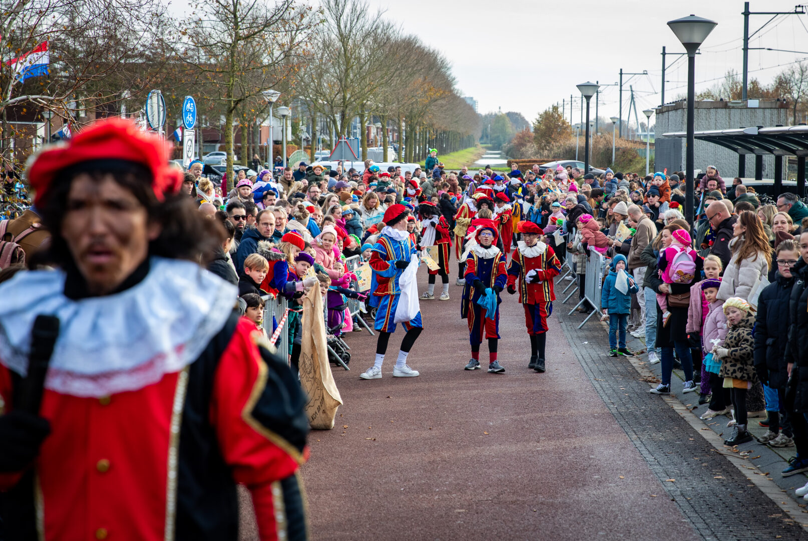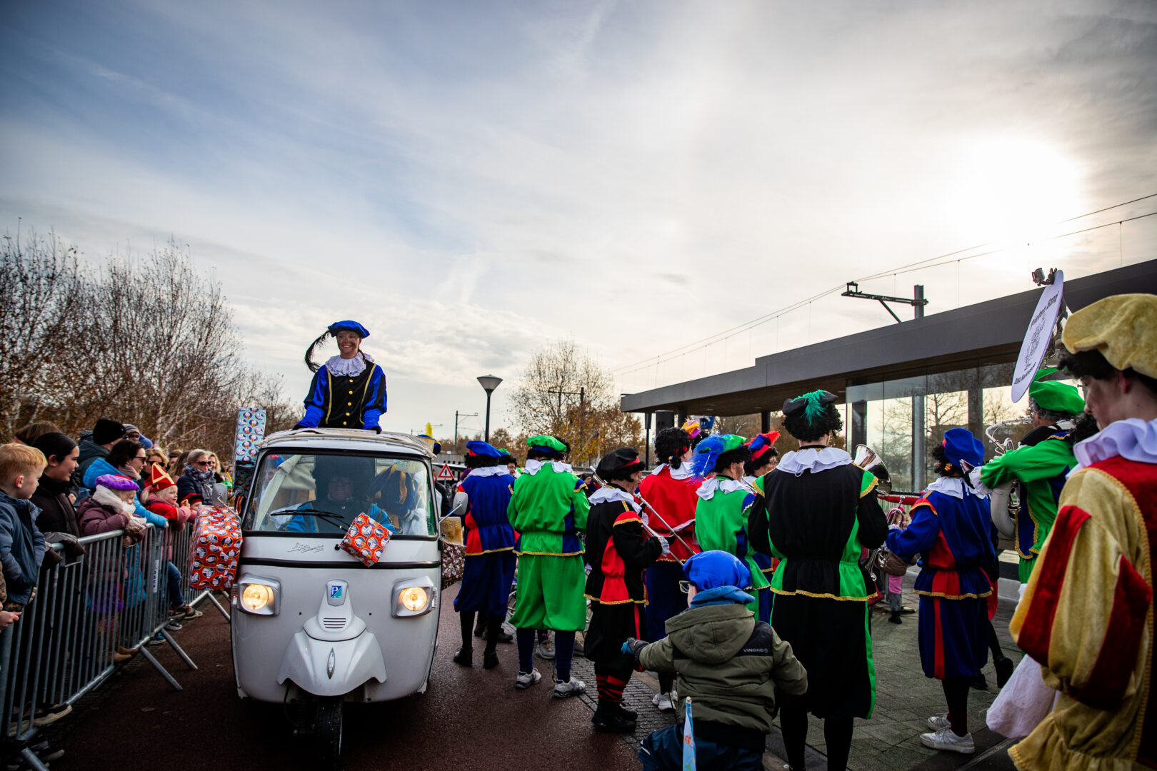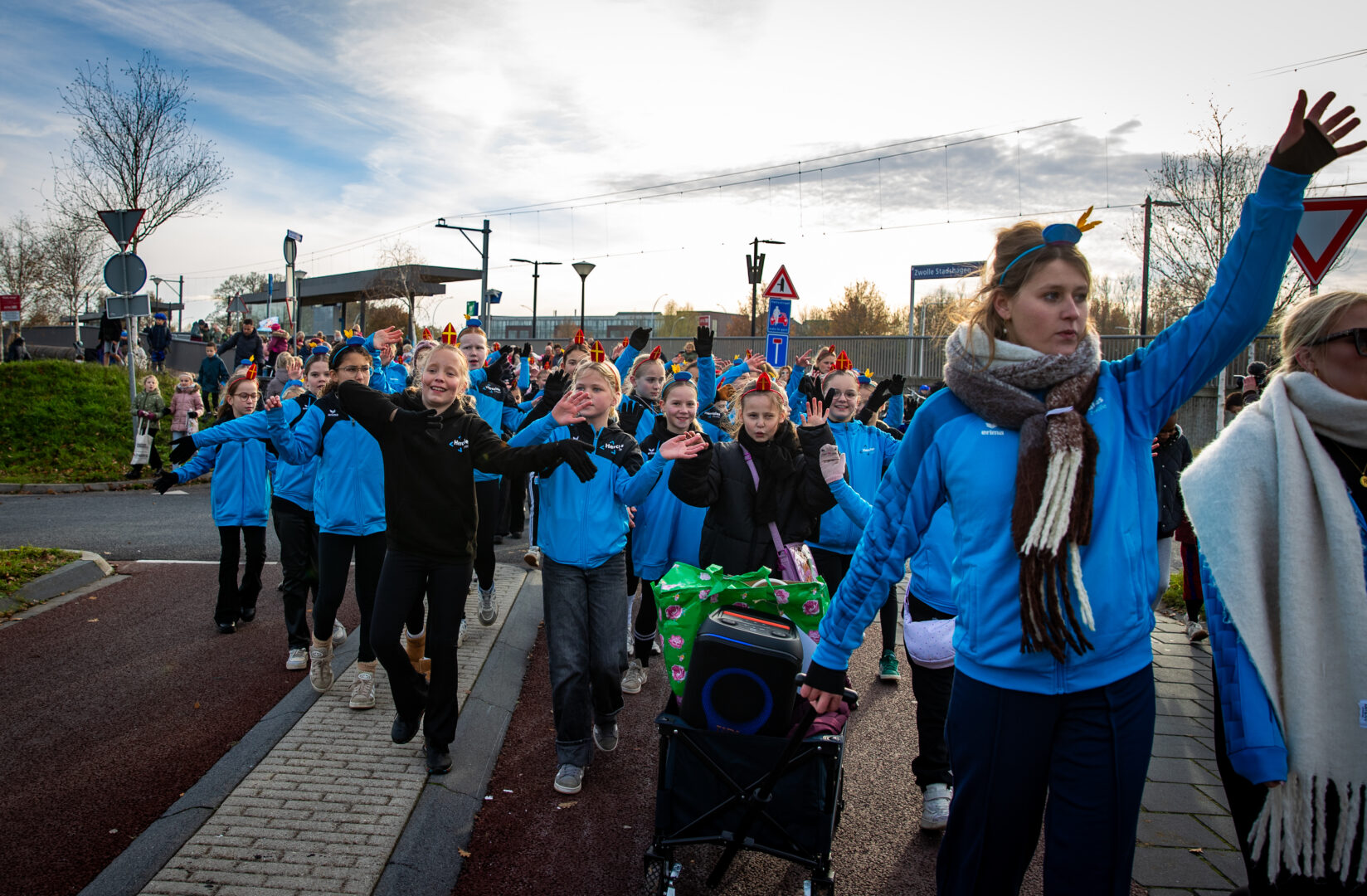 Even later arriveerde Sinterklaas alsnog op het station van Stadshagen, waar hij uitgebreid de tijd nam om handjes te geven en kinderen persoonlijk te begroeten. Daarna vertrok de stoet door de wijk. Voorop speelde de Pietenband, gevolgd door een tuktuk met Sinterklaas, daarachter jonge dansers van Hercules Zwolle en een lange rij ouders en kinderen. Langs de route vlogen de pepernoten opnieuw in het rond.