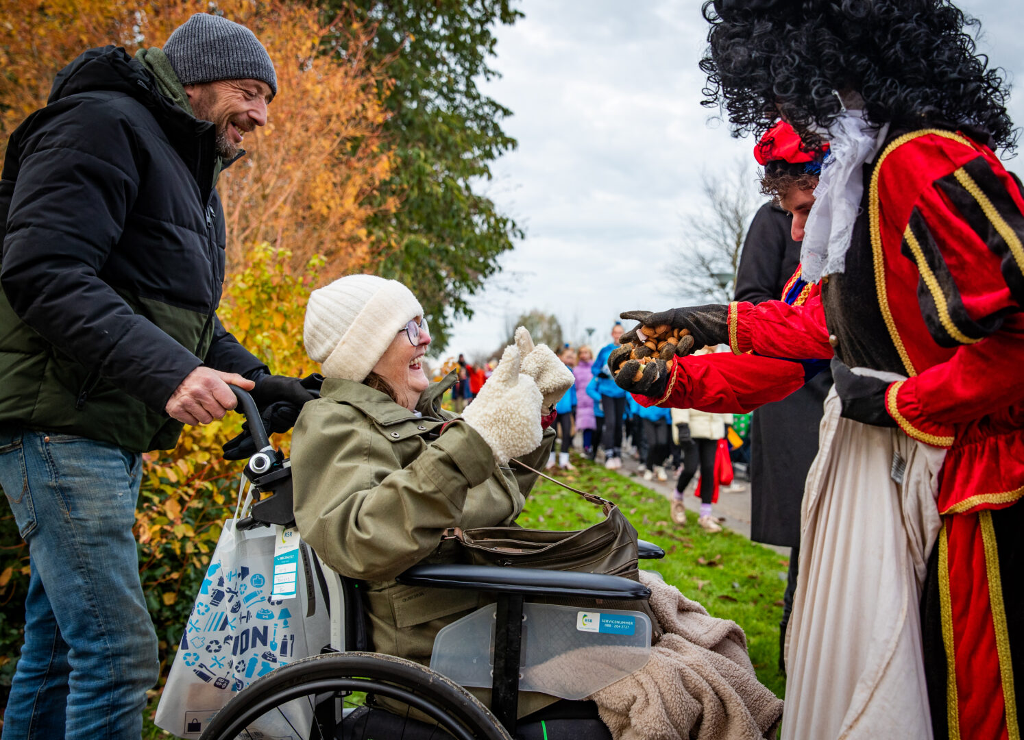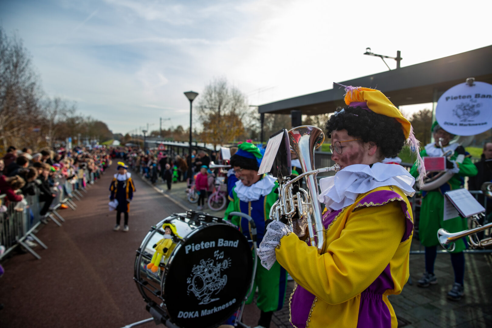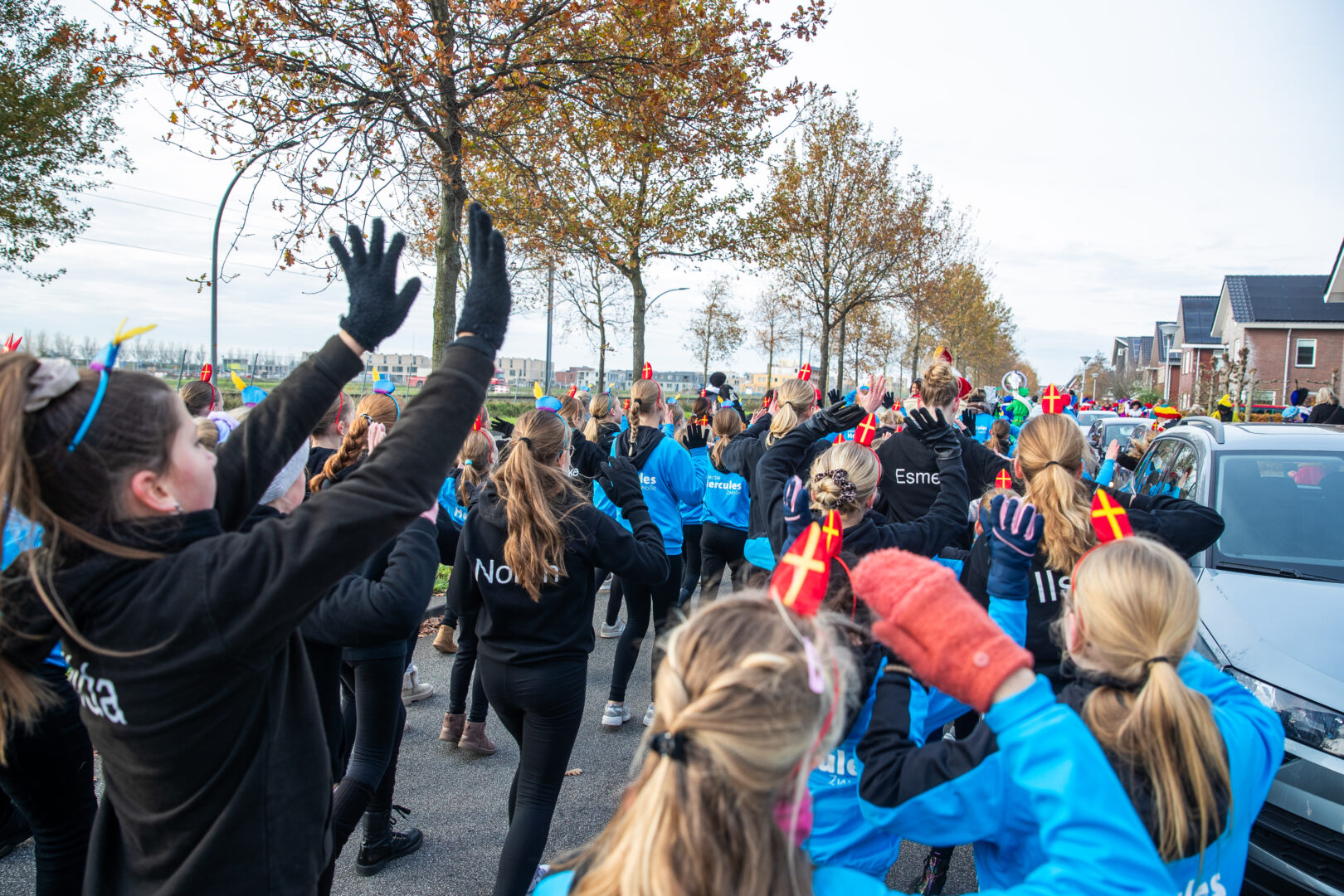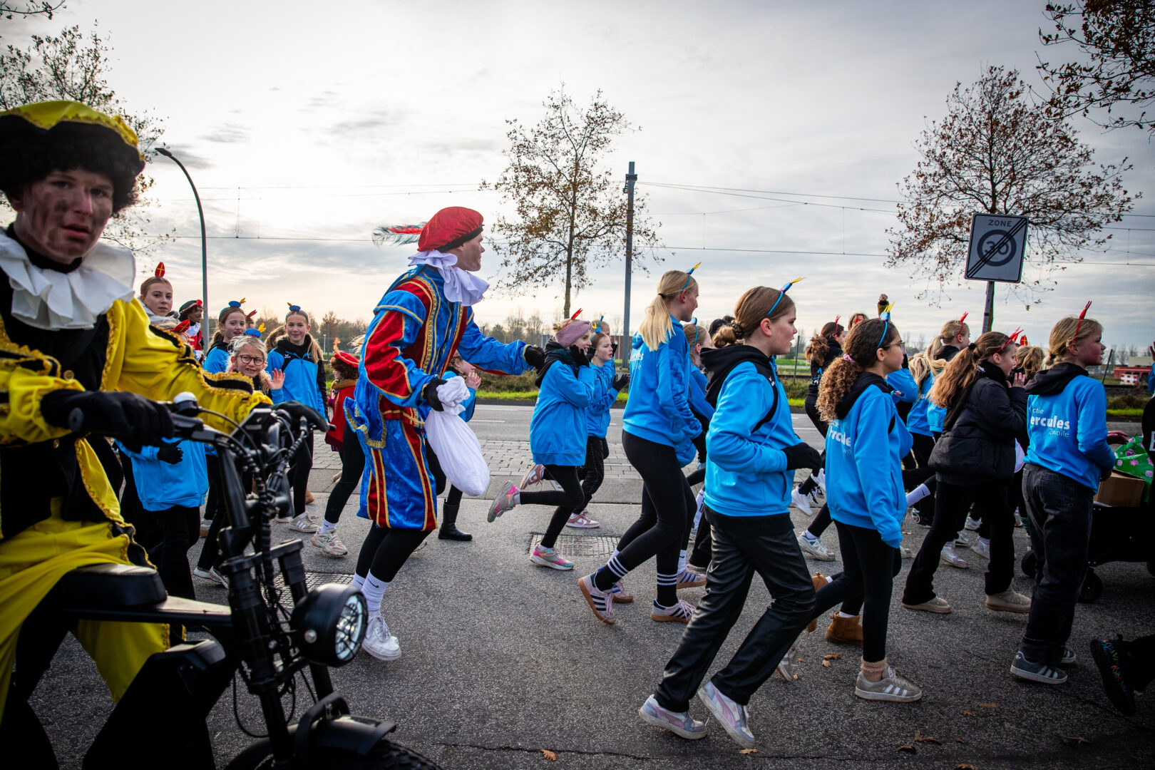 Even later arriveerde Sinterklaas alsnog op het station van Stadshagen, waar hij uitgebreid de tijd nam om handjes te geven en kinderen persoonlijk te begroeten. Daarna vertrok de stoet door de wijk. Voorop speelde de Pietenband, gevolgd door een tuktuk met Sinterklaas, daarachter jonge dansers van Hercules Zwolle en een lange rij ouders en kinderen. Langs de route vlogen de pepernoten opnieuw in het rond.