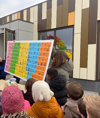 Leerlingen van de school maakten een gezamenlijk kunstwerk, dat nu een vaste plek heeft gekregen in de hal van het bijgebouw. Voor kinderen is het een zichtbaar teken dat dit hún plek is. Het symboliseert samenwerking en verbondenheid en onderstreept dat de uitbreiding niet alleen draait om extra vierkante meters, maar om ruimte om samen te leren en te groeien in de wijk Stadshagen.