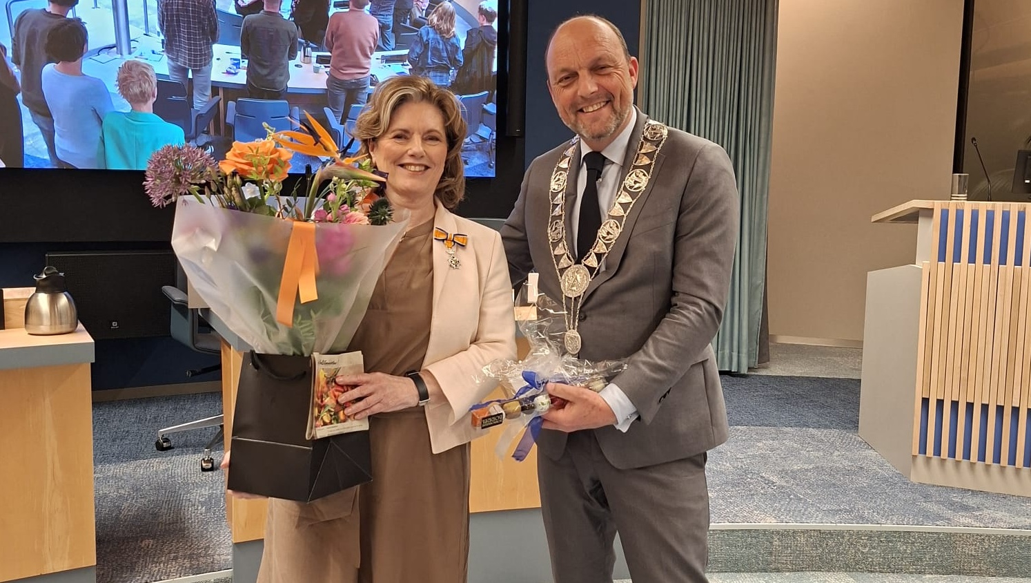 Burgemeester Peter Snijders heeft maandagavond de onderscheiding lid in de Orde van Oranje-Nassau uitgereikt aan vertrekkend raadslid Jolien Elshof uit Stadshagen.